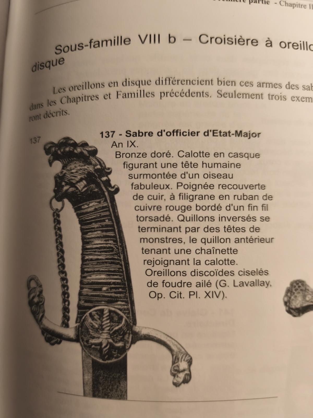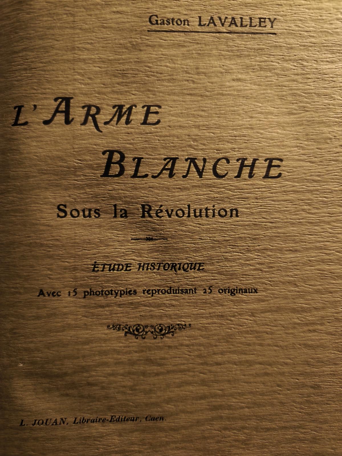 An identical saber was part of Gaston Lavalley's collection, featured on plate XIV of his work L'ARME BLANCHE SOUS LA RÉVOLUTION Étude Historique; L. Jouan, publisher, Caen 1912; reprinted in the work LES SABRES PORTÉS PAR L'ARMÉE FRANÇAISE by Jean Lhoste and Patrick Resek, éditions du Portail 2001, page 110.
