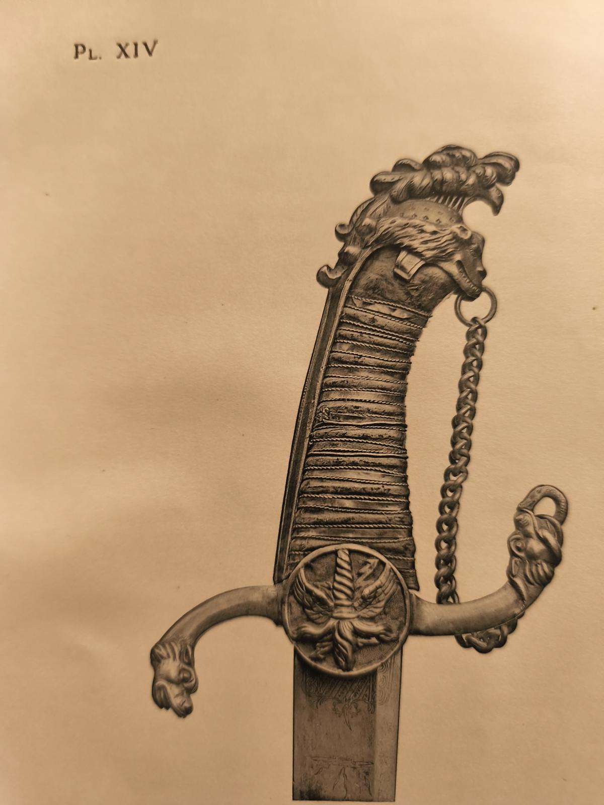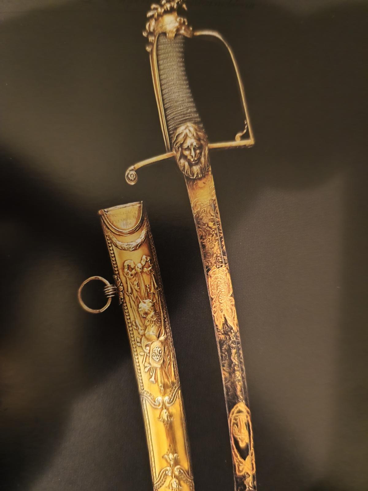 Gilded bronze hilt with la Marengo style. Crossguard with double inverted quillons ending in heads of mythological monsters, the downward curved part forming a quillon and the upward curved branch holding a chain connected to the pommel. Round-shaped ears cast in relief and finely chiseled with the winged and sparkling spindle of Jupiter. Cap with a long tail and a pommel shaped like a plumed helmet representing a lion's head surmounted by a starry bomb, a crest in the form of a bird's head, all topped with an abundant plume. Grip in wood covered in black waxed calfskin, filigree of copper and a ribbon of gilded brass. Curved blade with hollow facets, length 82.6 cm, width at the base 4 cm, engraved and gilded on its first third with military trophies, floral decorations and on the front face a Turk's head, all on a blued background. Scarlet cloth knot. Black varnished leather scabbard with three gilt brass fittings decorated with lines, scalloped edges, gilt brass rings and knobs.