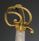 Brass hilt. Three-branch guard, with the two secondary branches terminating in a droplet shape at the lower part. Pommel with a long tang. Handle made of wood covered in black waxed calf leather with copper filigree. Curved blade with double grooves on each side, ribbed back, length 84.2 cm, engraved with military trophies and golden floral motifs on the first third against a blue background. Steel scabbard with three brass fittings. Protruding cup, belt rings decorated with fleurons framed by flat moldings, adorned with raised moldings, just like the belt loops.