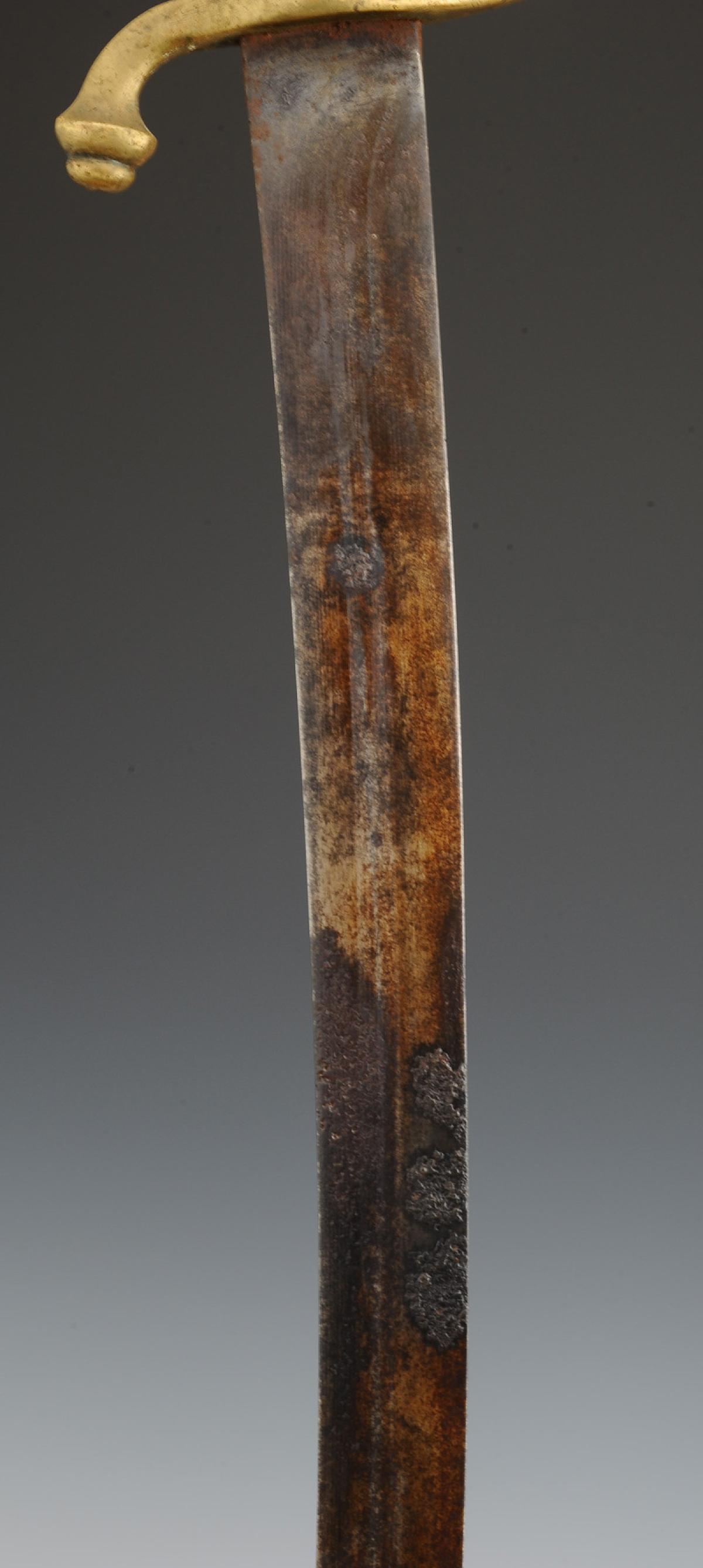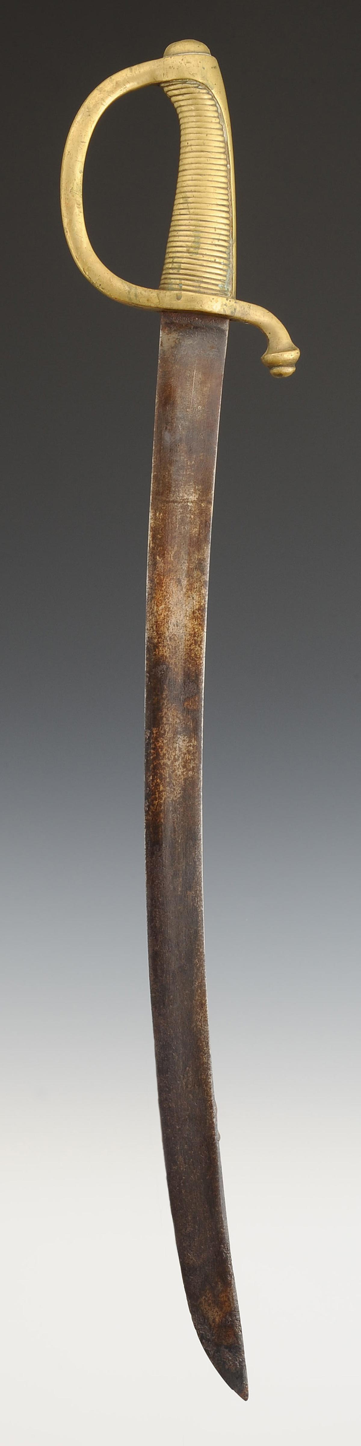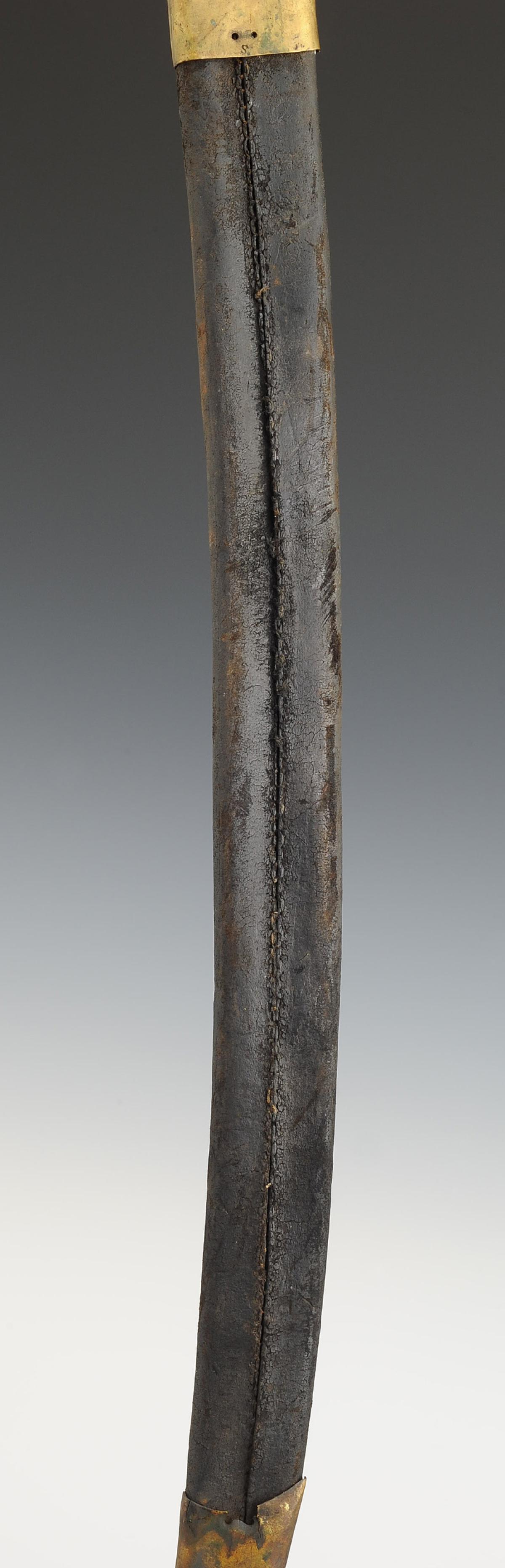 Brass one-piece hilt with single-branch guard. Handle with 39 wire windings. Slightly curved flat blade, length 57 cm. Black varnished leather scabbard with two brass fittings, an XI model ringed quillon.