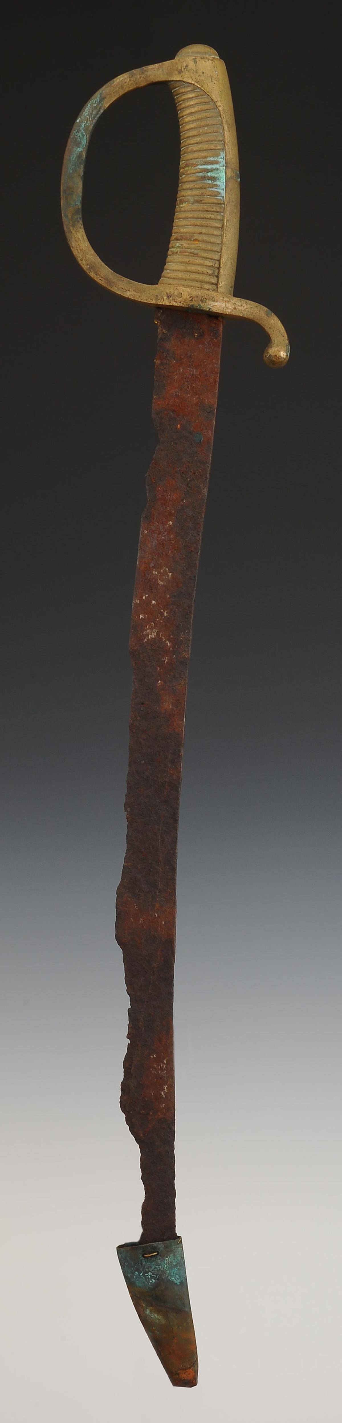 Monobloc brass hilt with a single-branch guard. Handle with 28 strands. Slightly curved flat blade, approximately 53 cm long. The end of the scabbard with its brass tip has remained welded by rust to the end of the blade.
