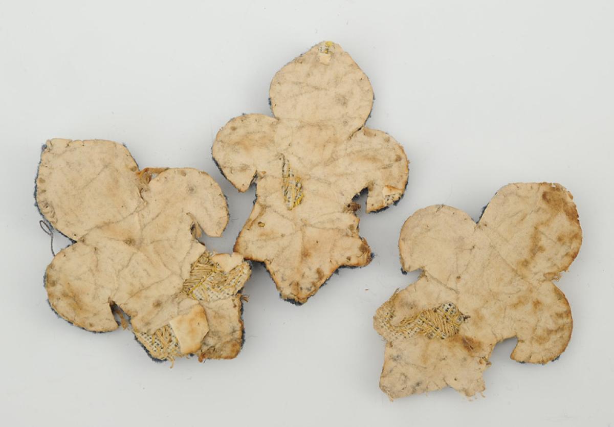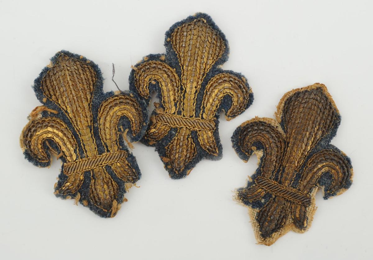 Three fleur-de-lis embroidered in gold thread and bullion on dark blue cloth.