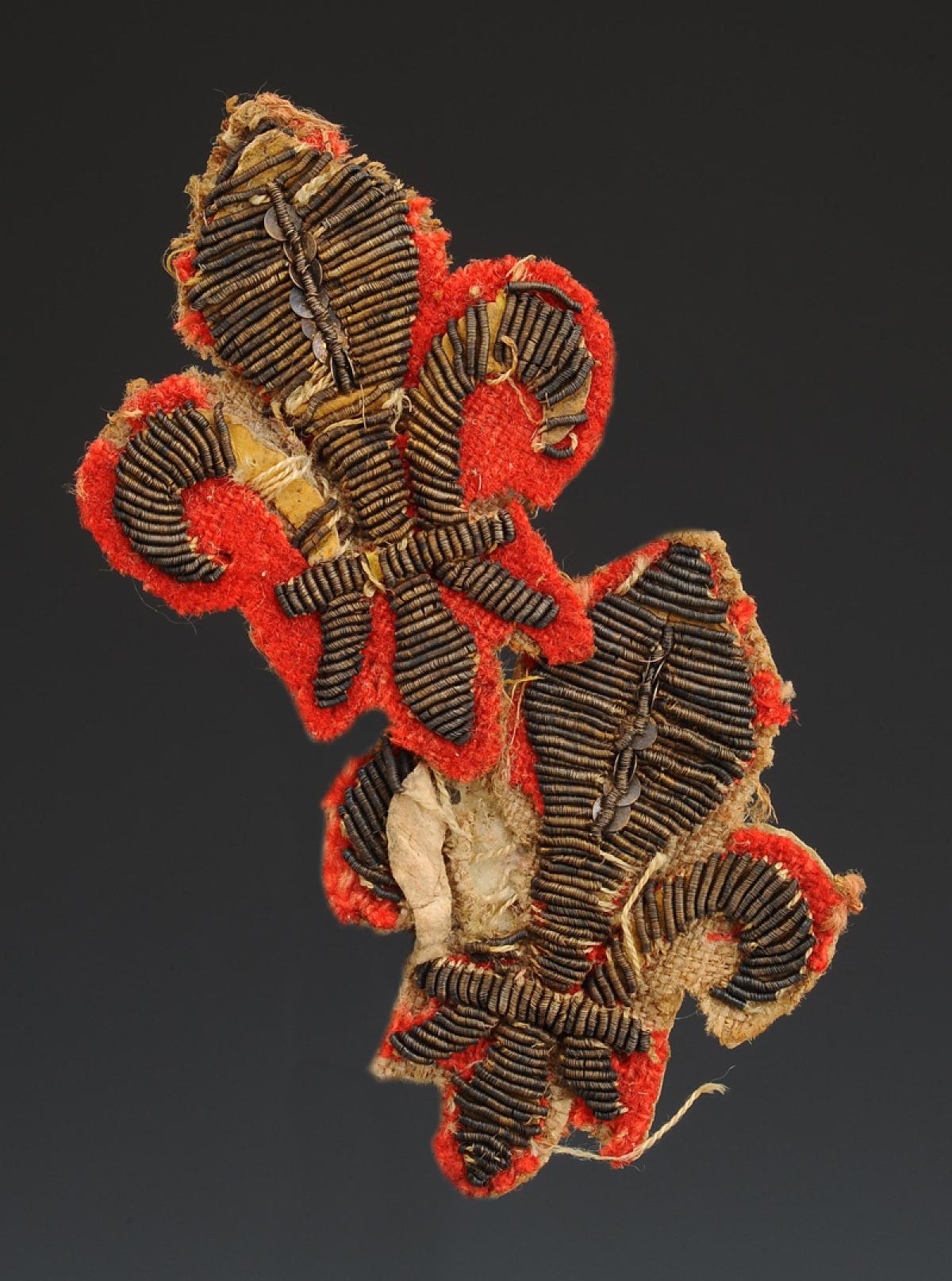 Two fleur-de-lis embroidered in silver threads and spangles on scarlet cloth.