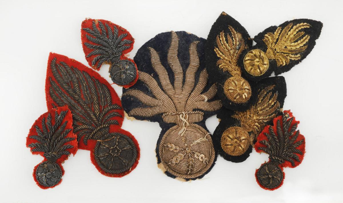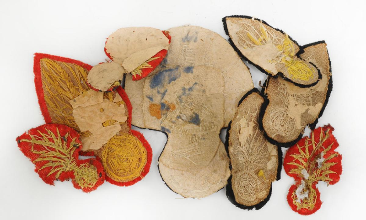 Fringed decorations embroidered in gold or silver threads and bullion on a dark blue or scarlet cloth background: two mismatched decorations and two sets of three decorations.