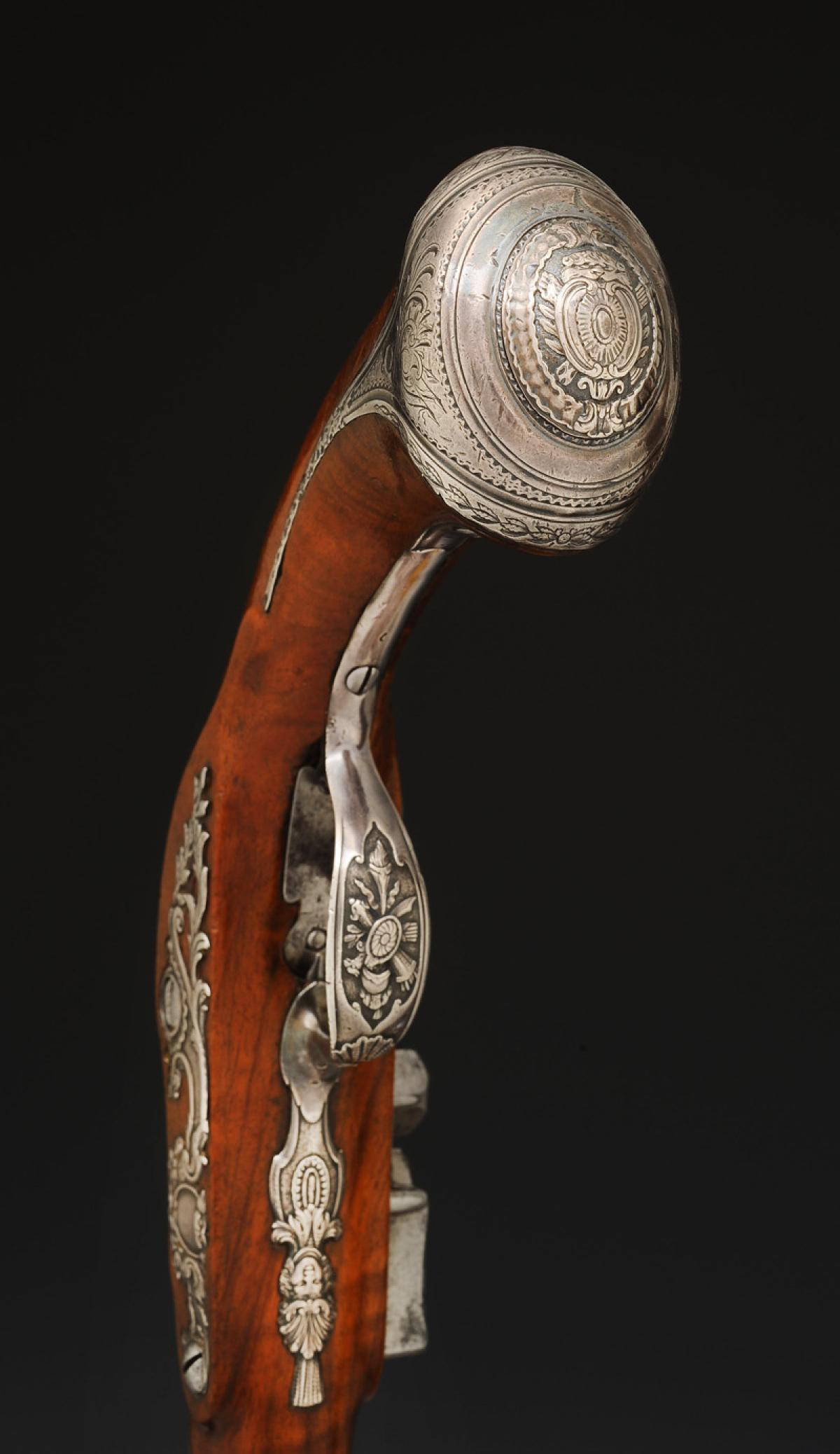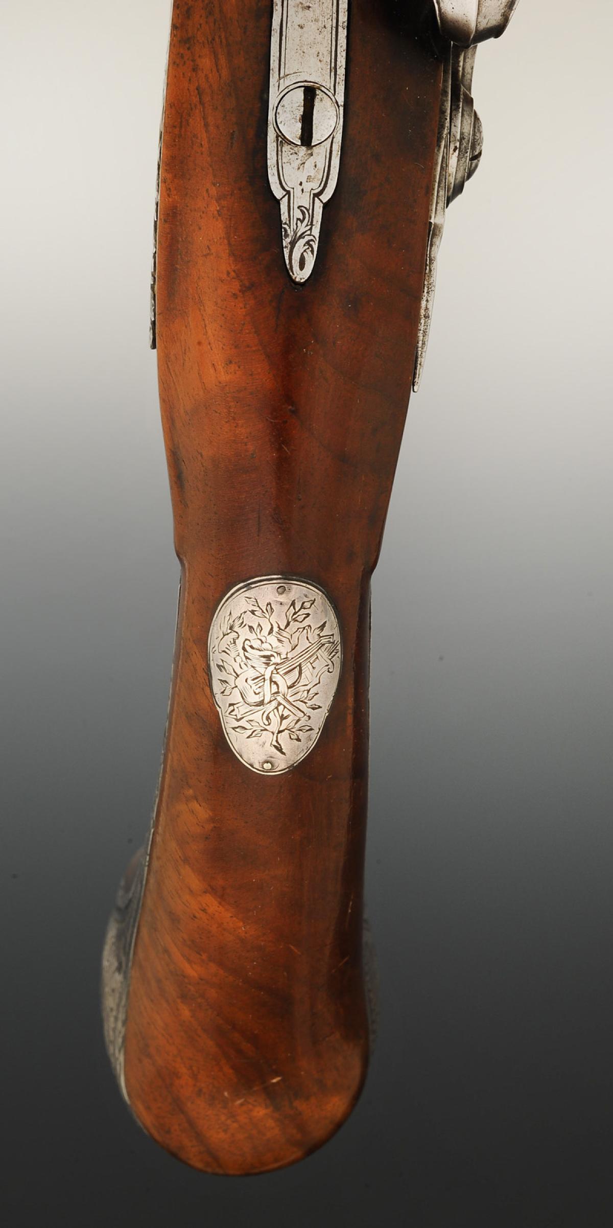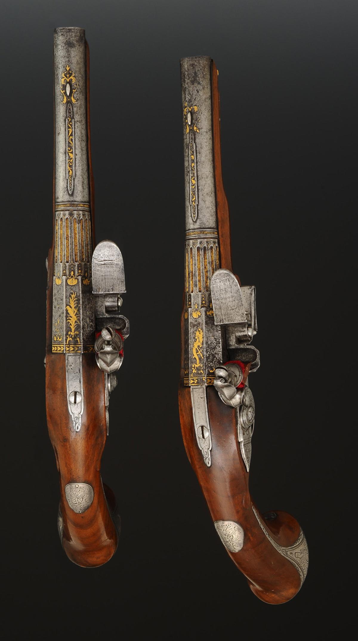 Octagonal and then round barrels, length 18.9 cm, with the breech 23.5 cm, caliber 15 mm, engraved and gilded with weapon trophies, scallop shells, and feathered leaves, all on a blued background. Flat-bodied locks decorated with weapon trophies and foliage, signed "Les La Roche Aux / Galleries du Louvre A Paris." Paneled sideplates. Swan-necked cocks engraved with floral scrolls. Walnut grips with long stocks. All fittings in hallmarked silver. Trigger guards decorated with relief military trophies and floral motifs. Counterplates decorated with a smooth coat of arms surrounded by cut-out and pierced flowers and foliage scrolls. Thumb pieces decorated with weapon trophies. Long-eared pommels engraved with weapon trophies, foliage, and feathered leaves. Oval caps decorated with foliage. Relief-molded ramrod holders. Whalebone ramrods with bone tips.