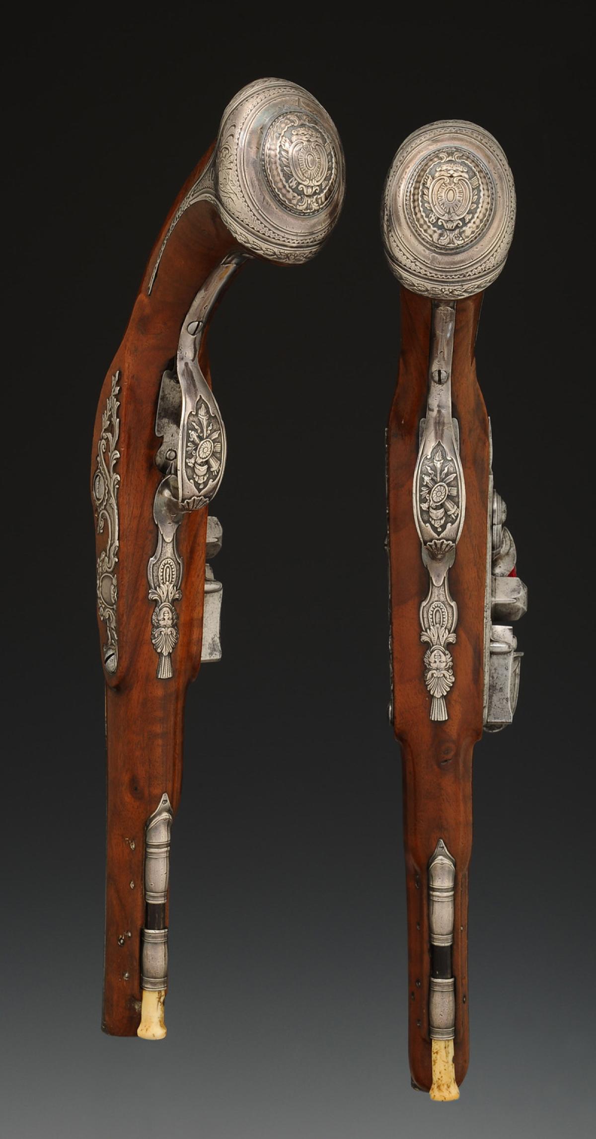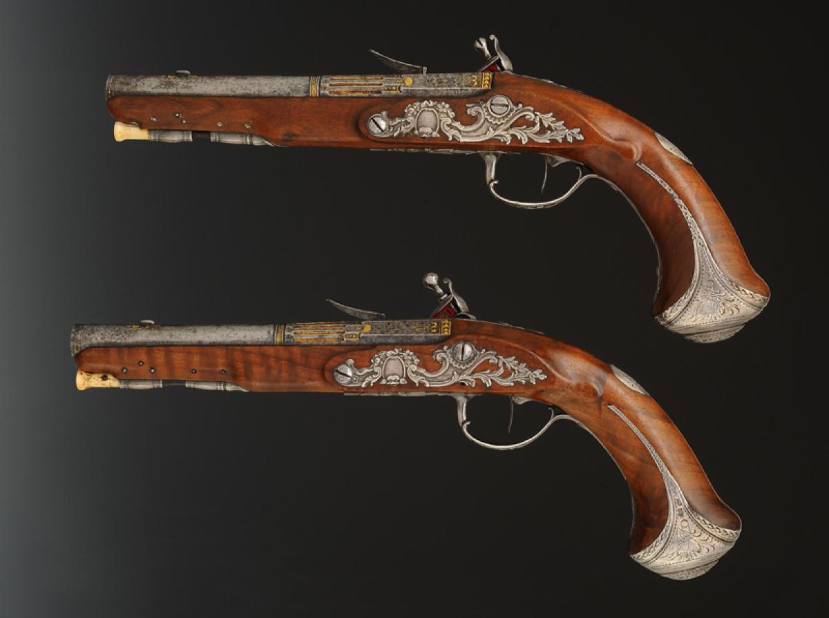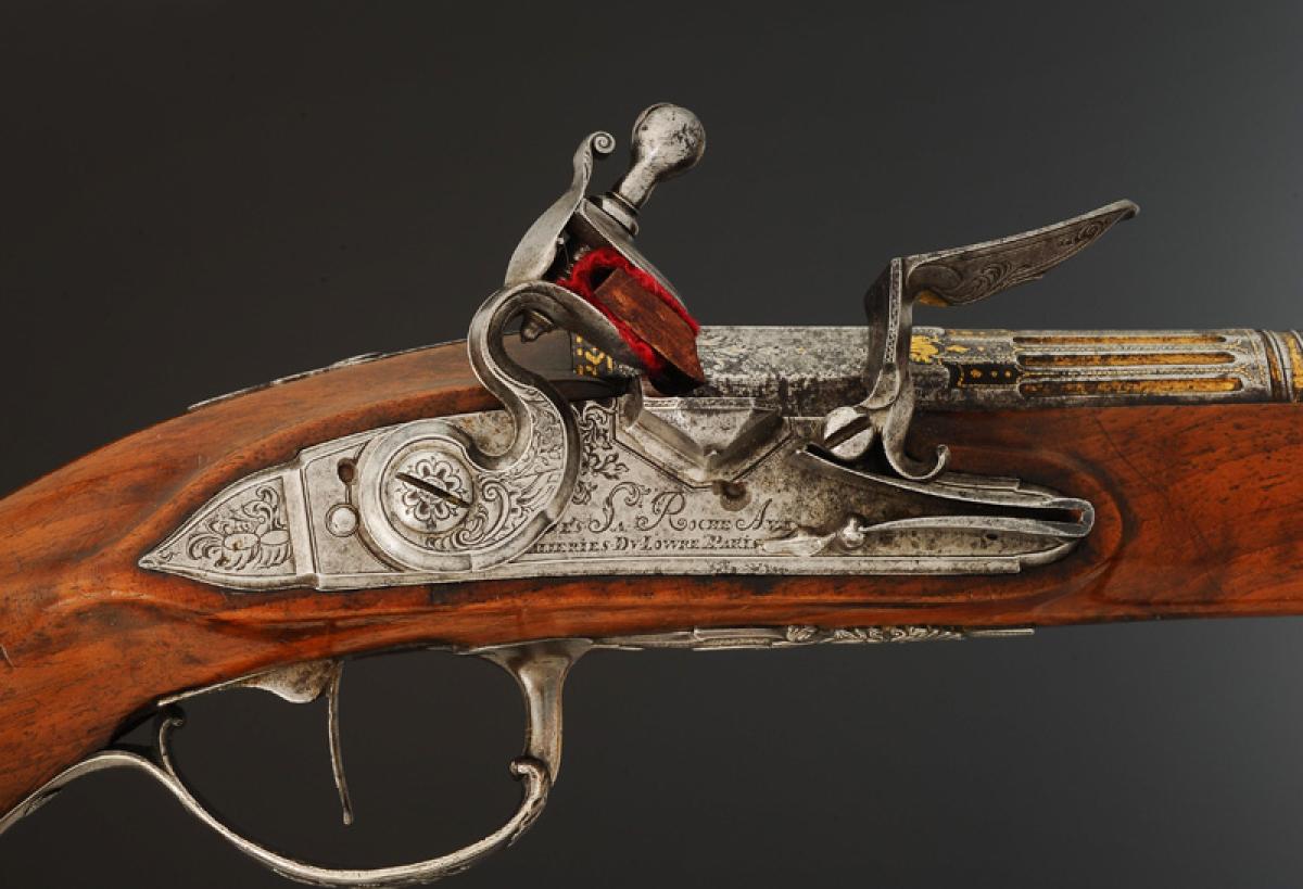 Octagonal and then round barrels, length 18.9 cm, with the breech 23.5 cm, caliber 15 mm, engraved and gilded with weapon trophies, scallop shells, and feathered leaves, all on a blued background. Flat-bodied locks decorated with weapon trophies and foliage, signed "Les La Roche Aux / Galleries du Louvre A Paris." Paneled sideplates. Swan-necked cocks engraved with floral scrolls. Walnut grips with long stocks. All fittings in hallmarked silver. Trigger guards decorated with relief military trophies and floral motifs. Counterplates decorated with a smooth coat of arms surrounded by cut-out and pierced flowers and foliage scrolls. Thumb pieces decorated with weapon trophies. Long-eared pommels engraved with weapon trophies, foliage, and feathered leaves. Oval caps decorated with foliage. Relief-molded ramrod holders. Whalebone ramrods with bone tips.
