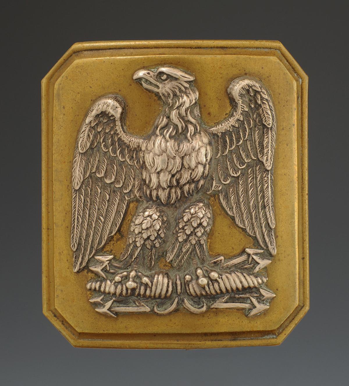 A gilded brass belt buckle plaque, rectangular in shape with cut corners, dimensions 5.9 cm x 5.2 cm, decorated in the center with a non-crowned silver-stamped eagle holding the shining lightning bolt of Jupiter in its talons. The plaque includes its hook and prong, lined with green basane.