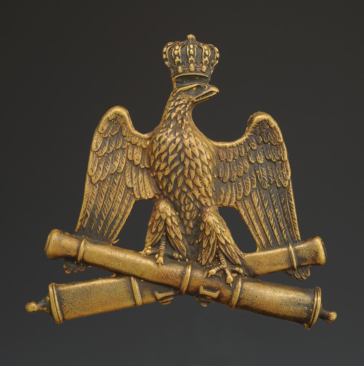 Made of brass, cut and stamped in relief with a crowned imperial eagle resting on two crossed cannons. Dimensions: 8.3 cm x 9.3 cm. Complete with its five attachments on the back.