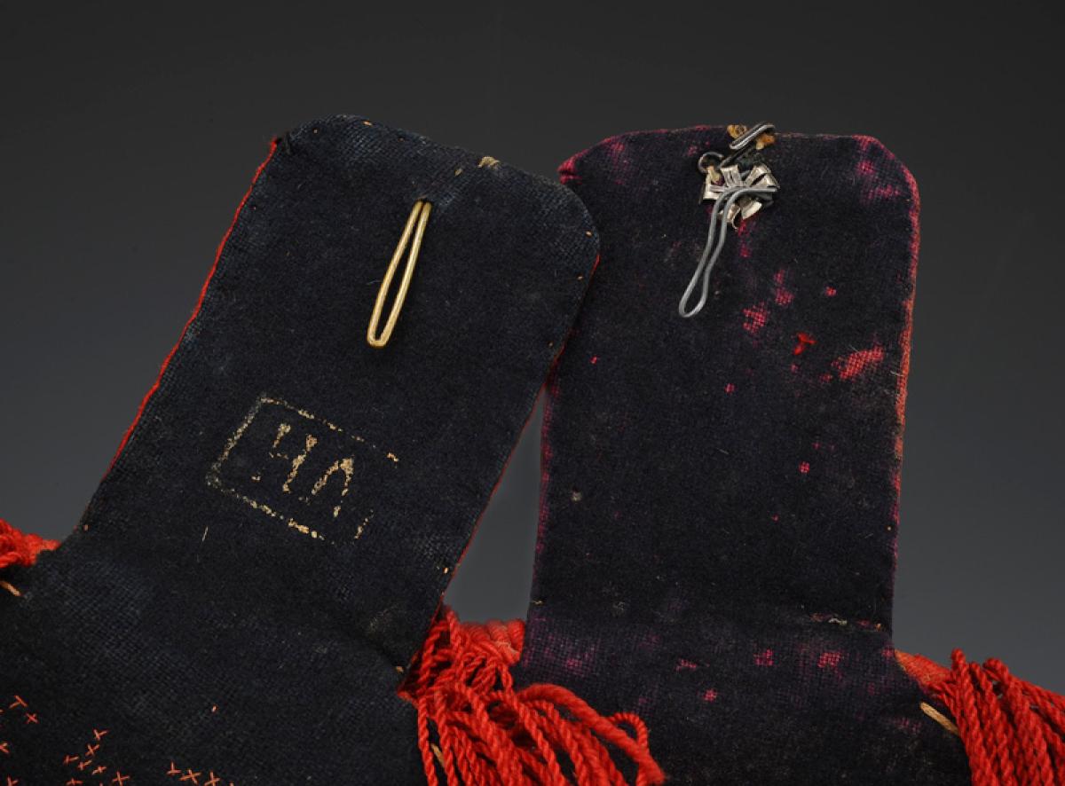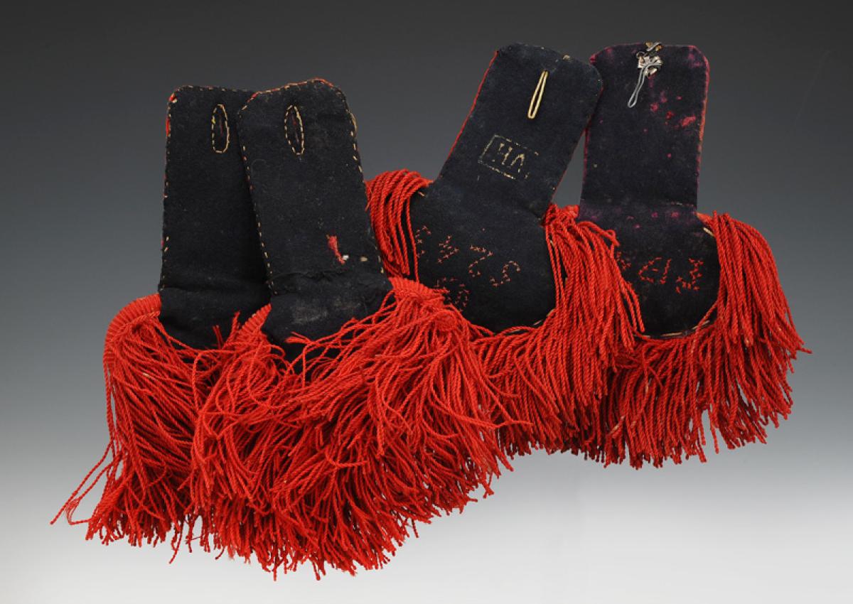 Made of scarlet wool with soft fringes. Lined with dark blue cloth.
