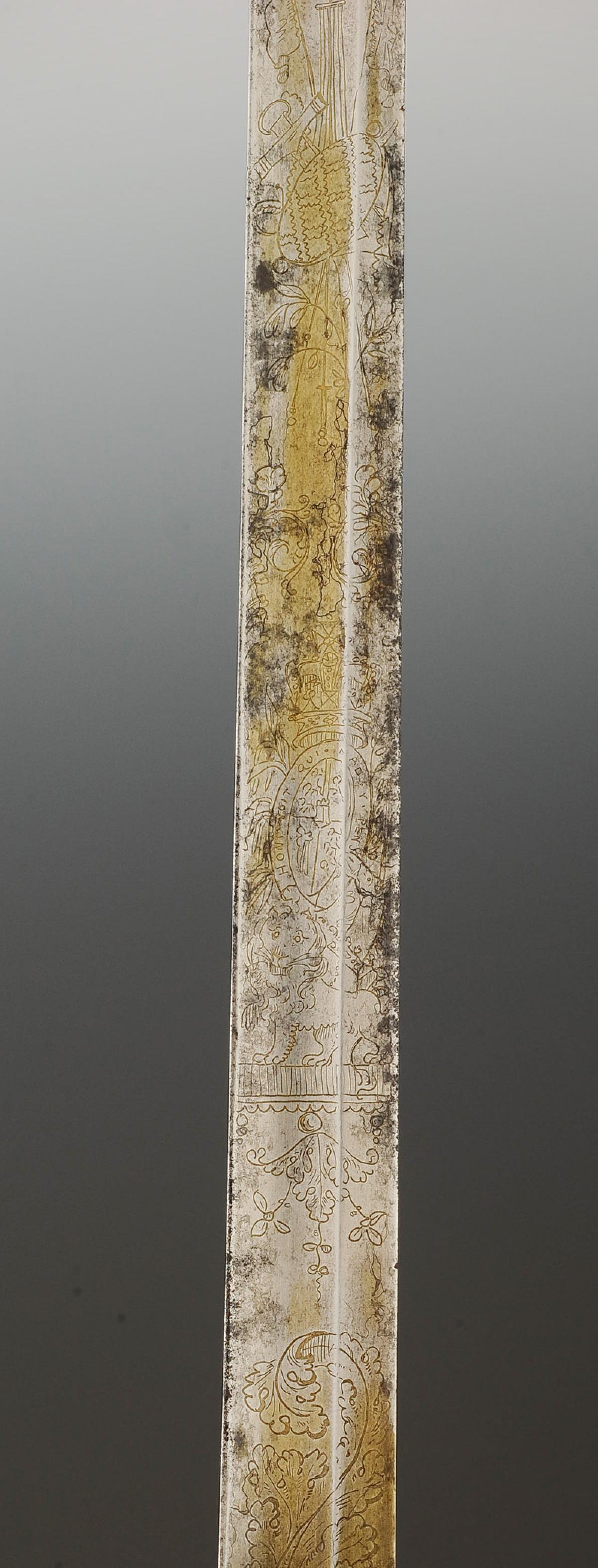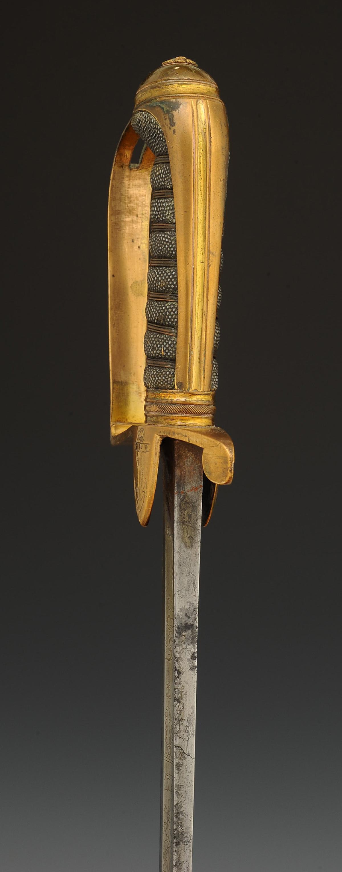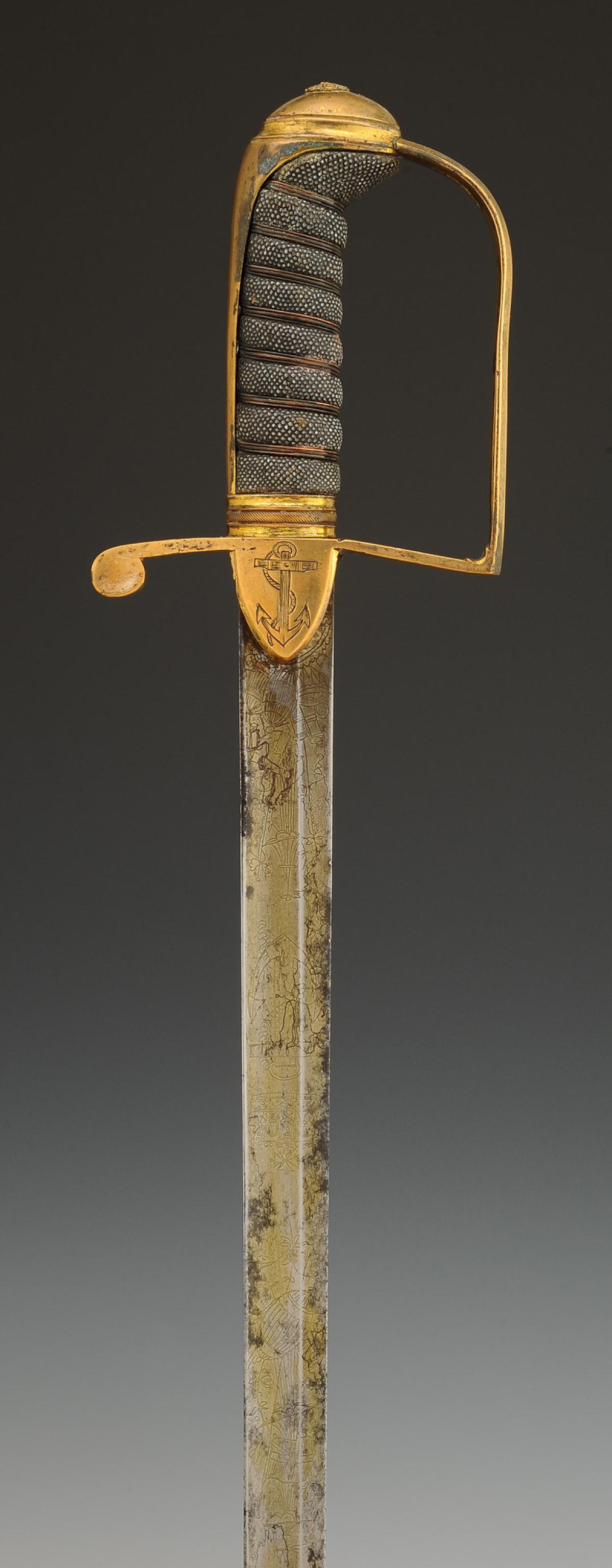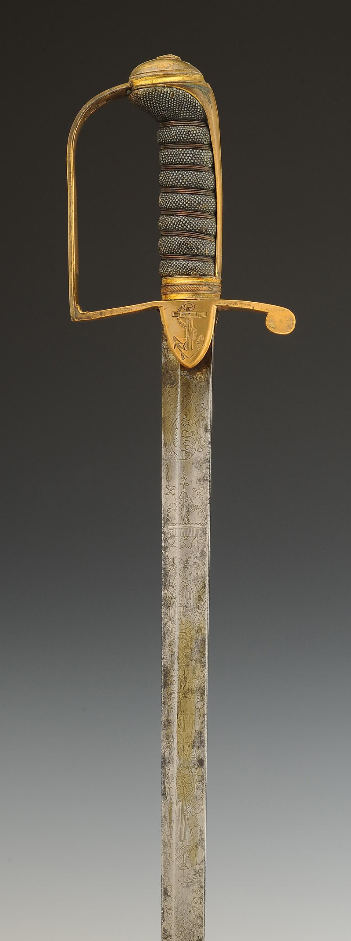 Pink brass hilt. Guard with one branch and engraved cruise ears with a marine anchor. Long-tailed pommel. Handle of grey sharkskin-clad wood, copper filigree. Fluted ferrule. Straight blade with hollow bevels, length 72.5 cm, engraved on its first half with floral motifs and the Coat of Arms of the United Kingdom. Black varnished leather scabbard with three pink brass fittings decorated with scalloped lines and edges.