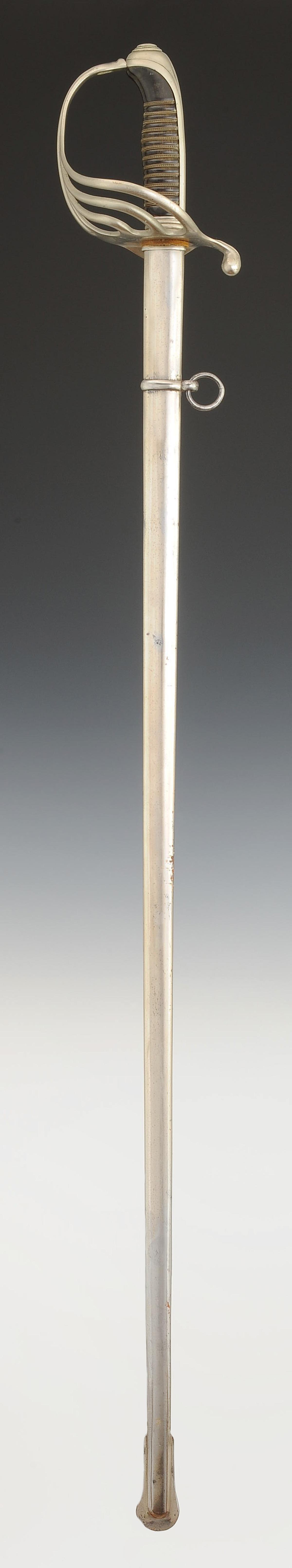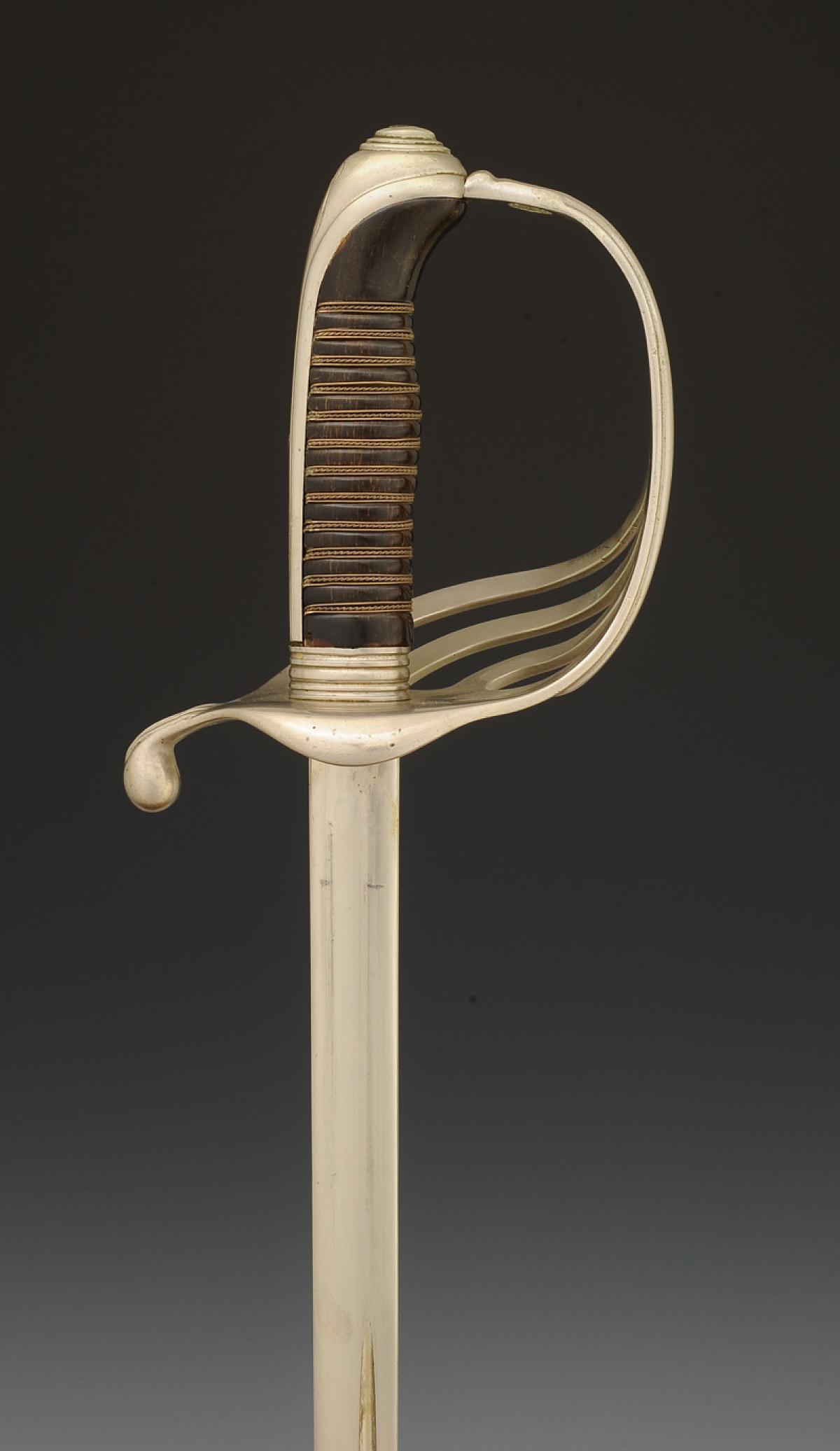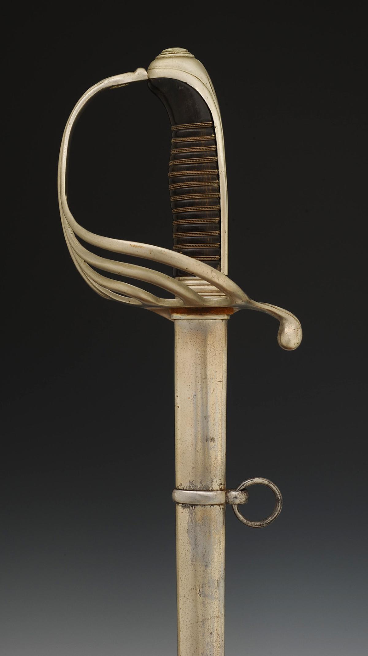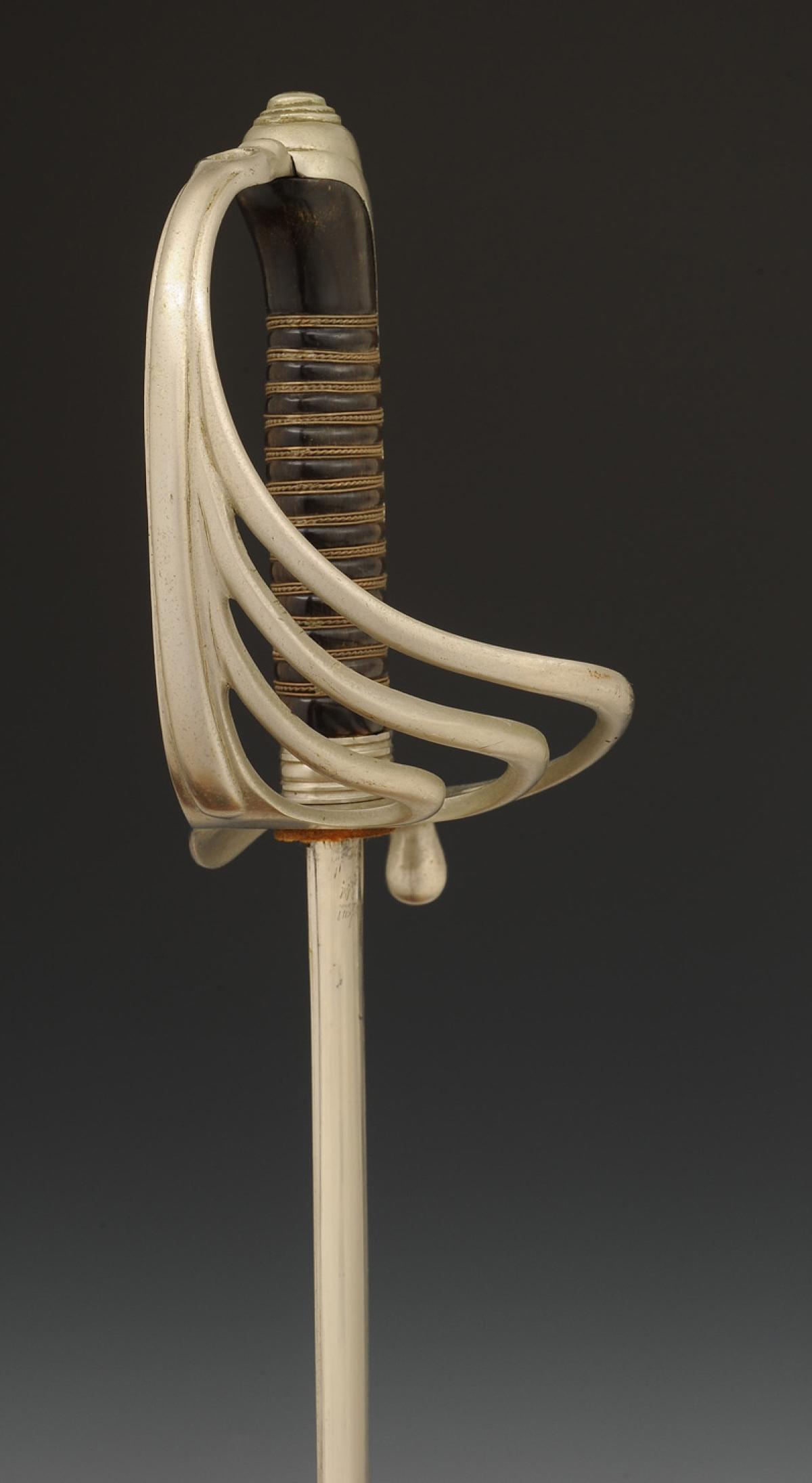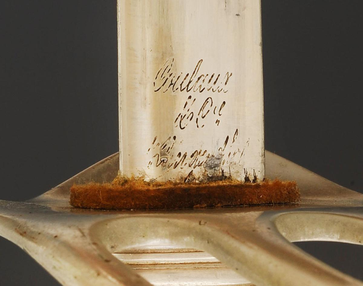 Four-branched nickel-plated steel guard. Cap with long queue. Horn handle with silvered copper wire filigree. Straight nickel-plated blade with grooves, length 91 cm, signed at the tang "Coulaux & Cie Klingenthal." Natural leather knot. Nickel-plated steel scabbard with one suspension ring band.
