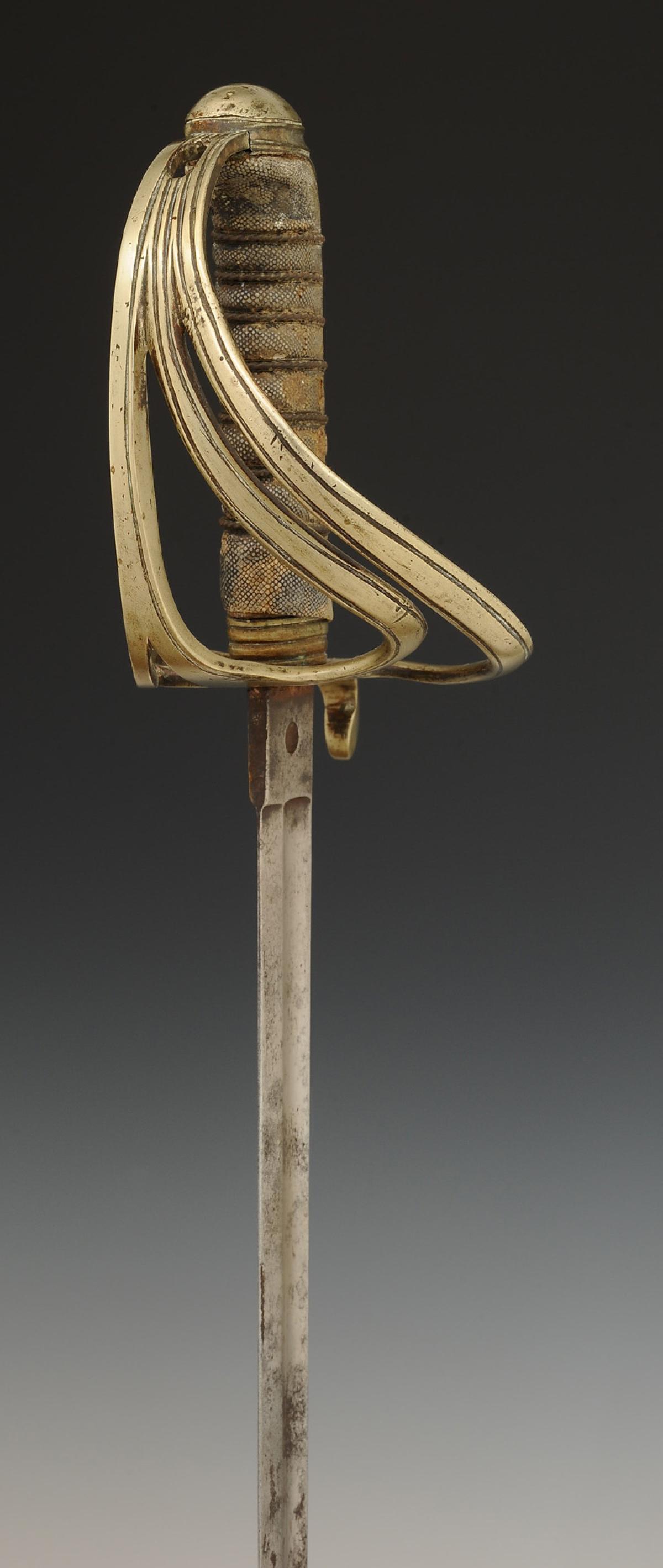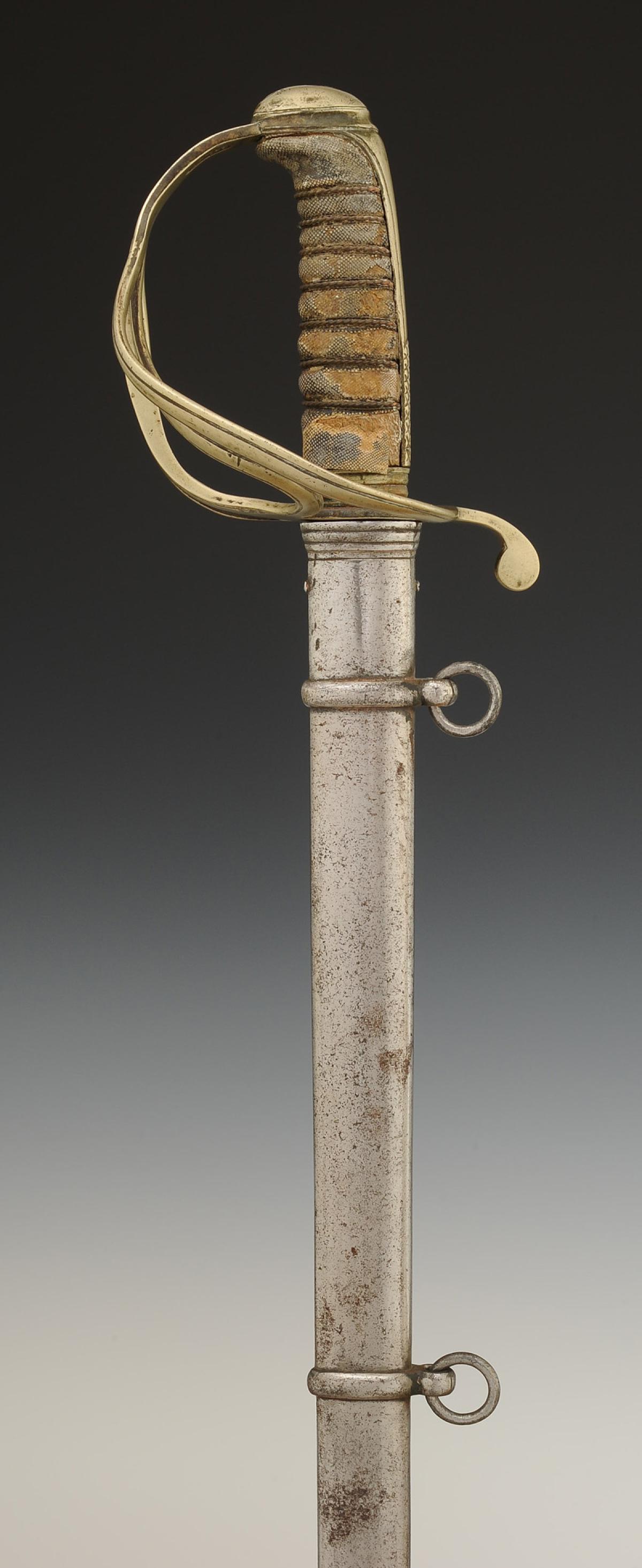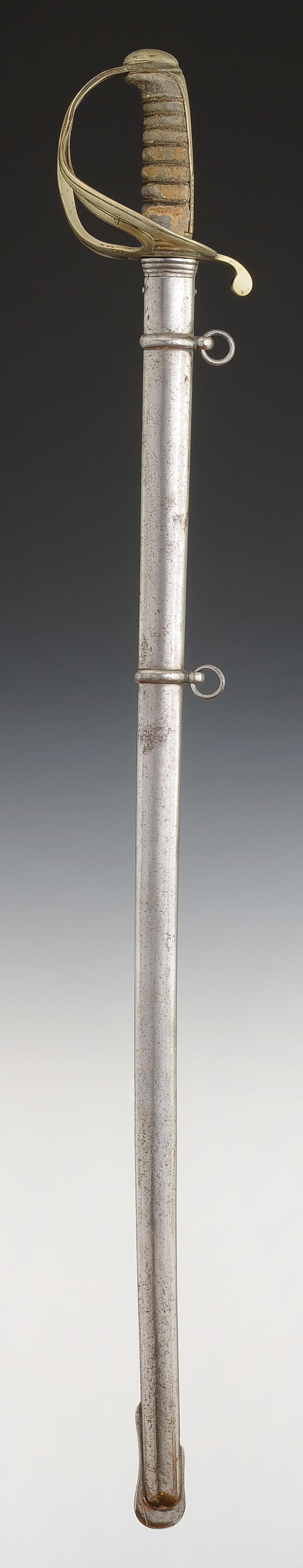 Steel hilt with a three-branch guard and a long-tailed pommel. Handle made of wood covered with grey shagreen with silver-copper filigree. Straight blade with grooves, unmarked, 82 cm long. Steel scabbard with two suspension rings.