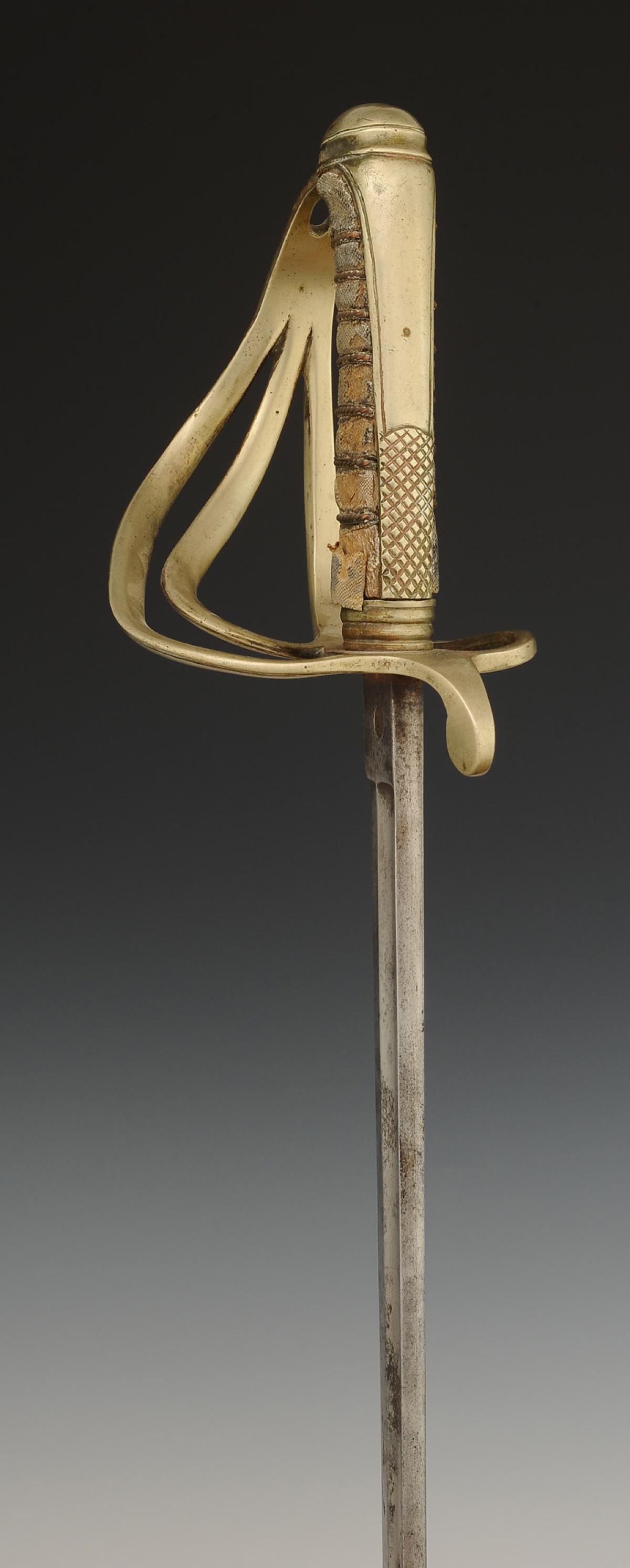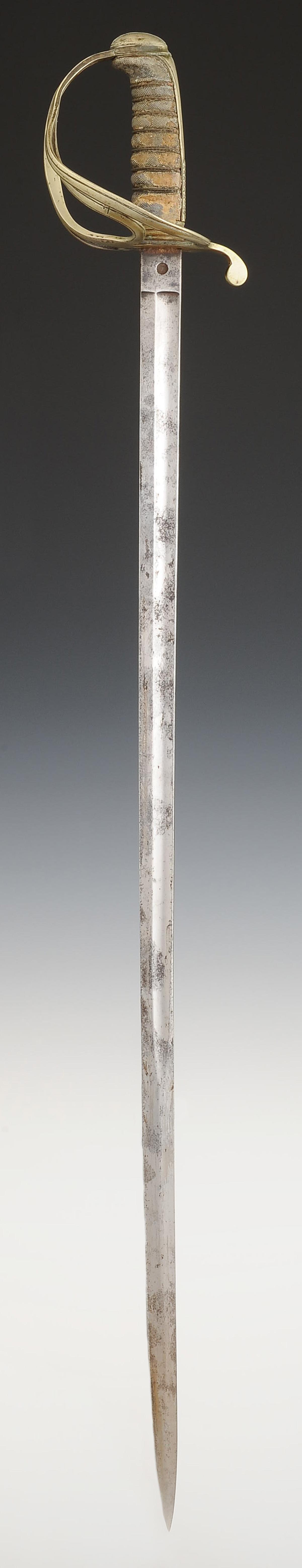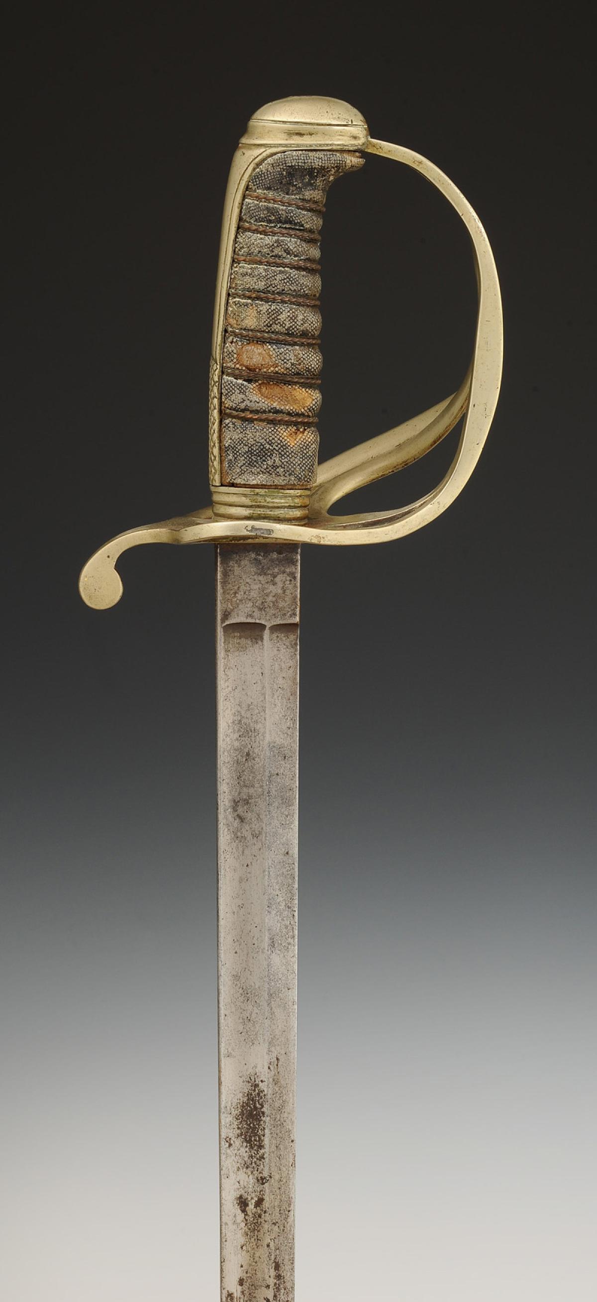 Steel hilt with a three-branch guard and a long-tailed pommel. Handle made of wood covered with grey shagreen with silver-copper filigree. Straight blade with grooves, unmarked, 82 cm long. Steel scabbard with two suspension rings.