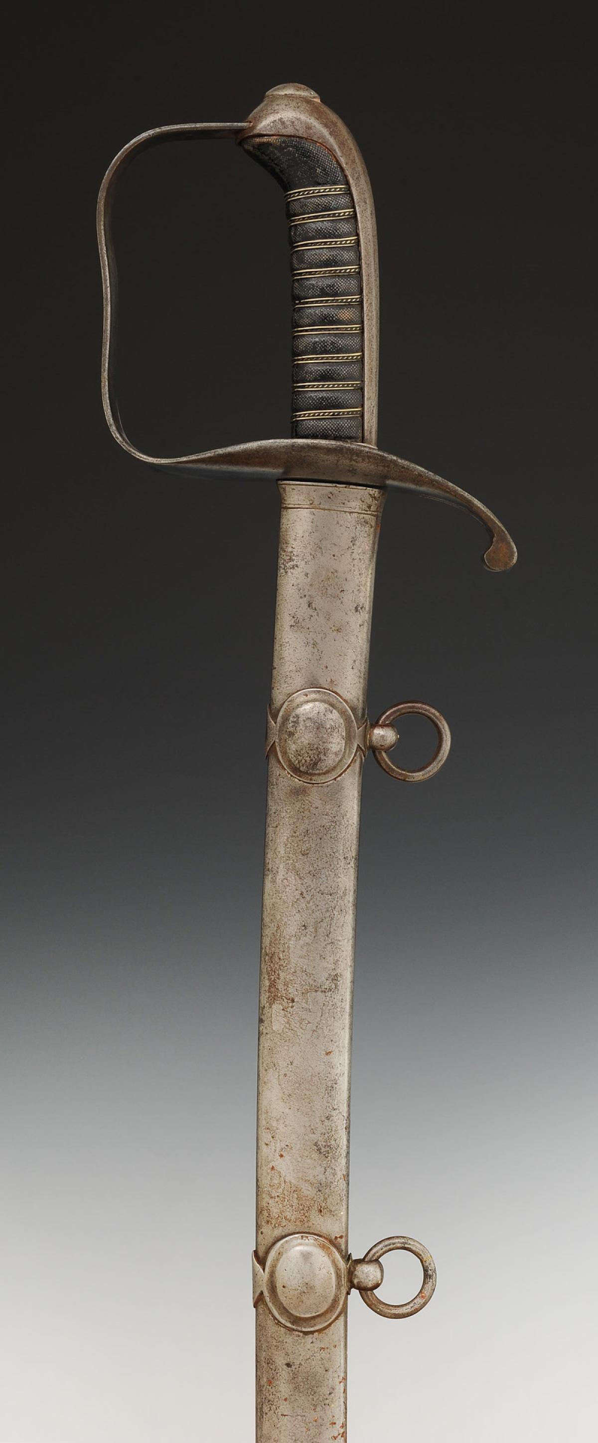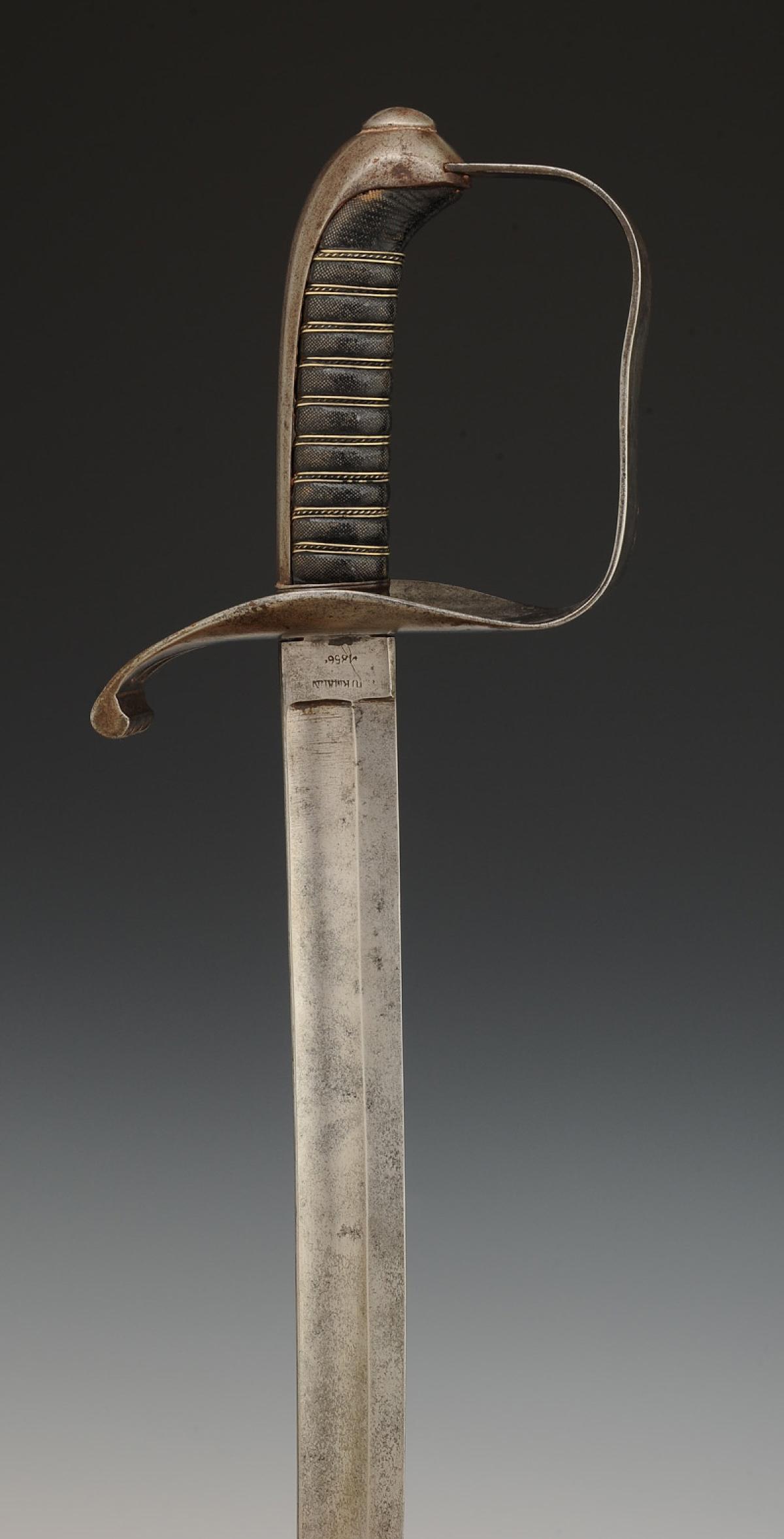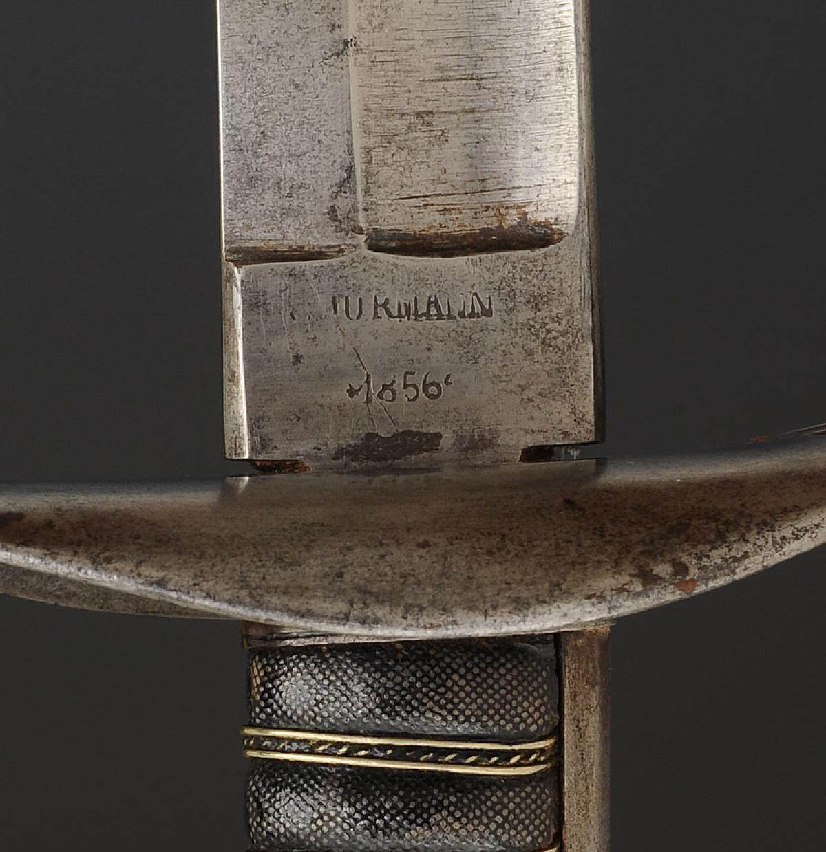 Blade made of steel. Guard with a wide and flat branch. Pierced quillon. Cap with a long tang. Handle made of wood covered with dark gray shagreen, filigree in silver. Curved blade with hollow edges, length 81.5 cm, dated "1856". Steel scabbard with two oval medallion-shaped suspension rings.