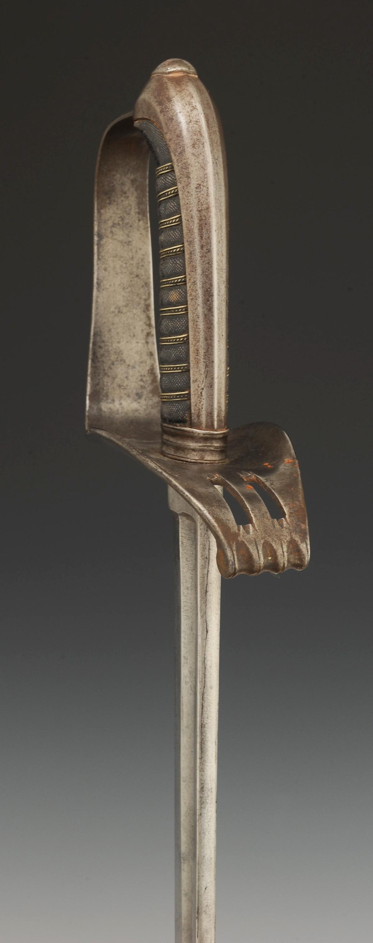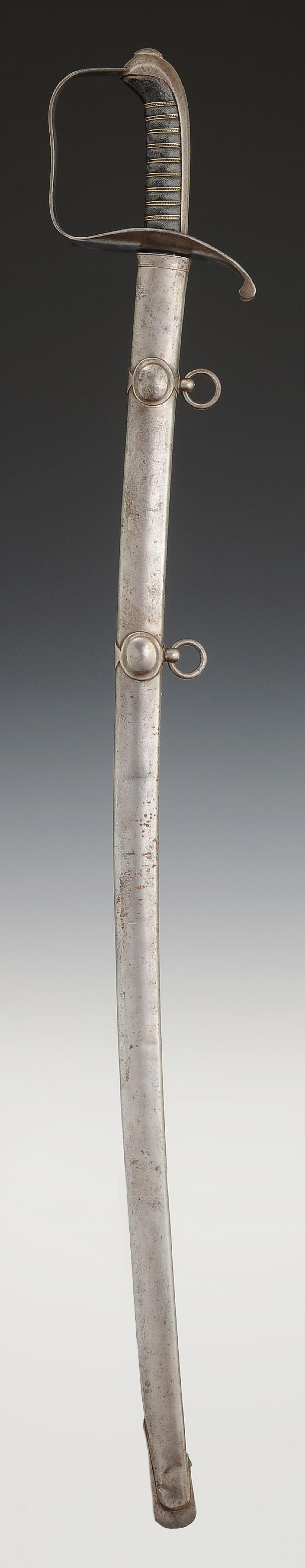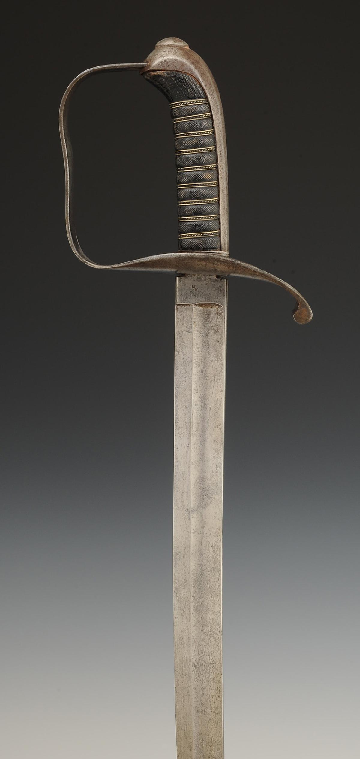 Blade made of steel. Guard with a wide and flat branch. Pierced quillon. Cap with a long tang. Handle made of wood covered with dark gray shagreen, filigree in silver. Curved blade with hollow edges, length 81.5 cm, dated "1856". Steel scabbard with two oval medallion-shaped suspension rings.