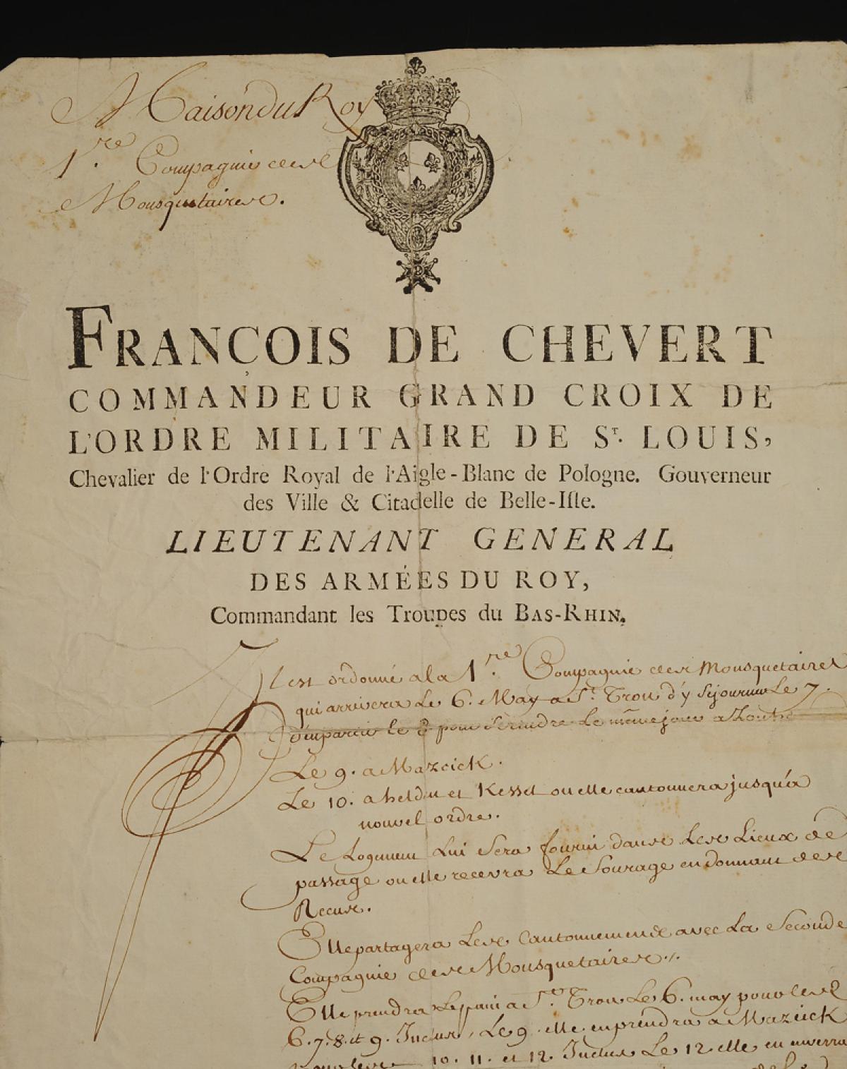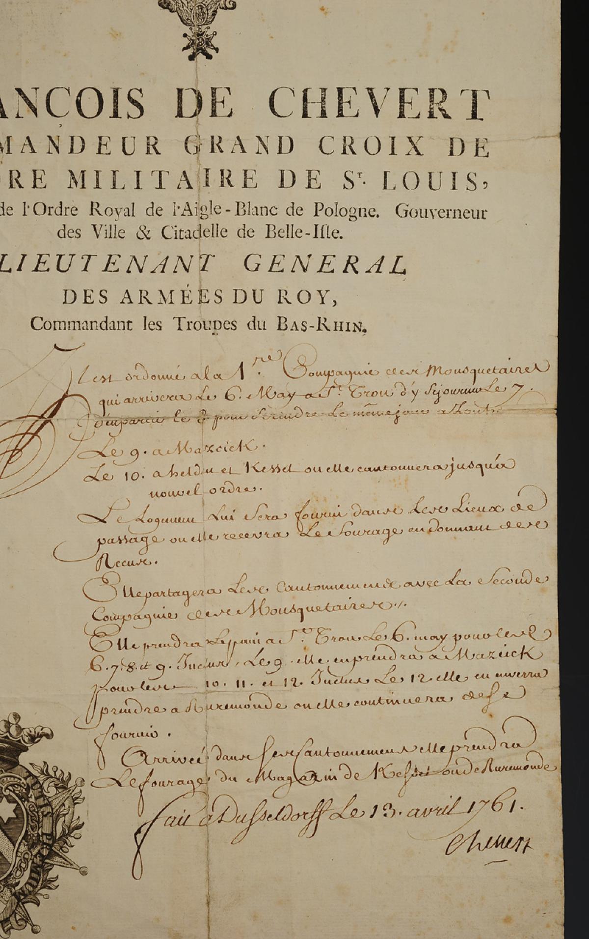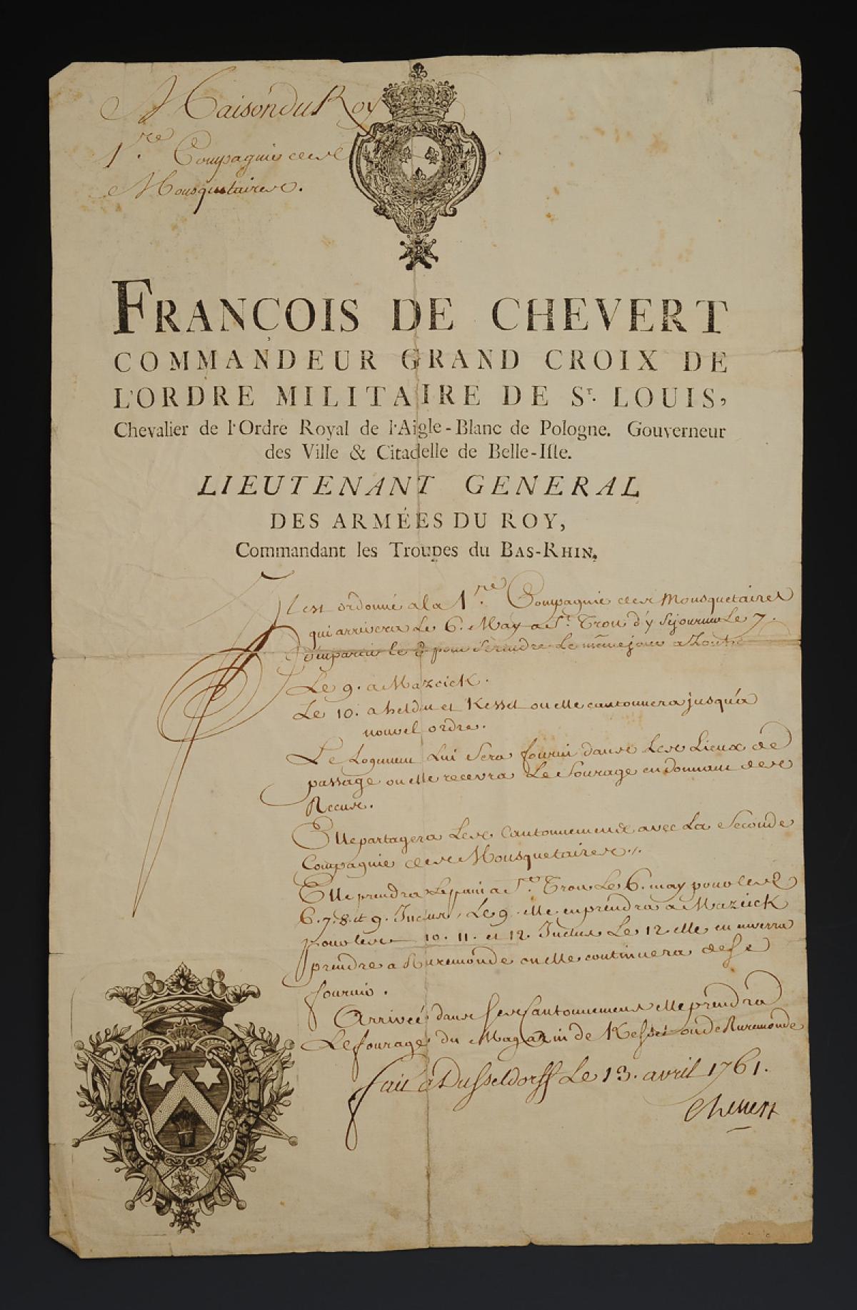 ORDER GIVEN BY FRANÇOIS DE CHEVERT FOR THE QUARTERING OF THE 1st COMPANY OF THE KING'S MUSKETEERS AT HIS LOCATIONS OF PASSAGE, Old Monarchy, dated April 13, 1761. 29238-3