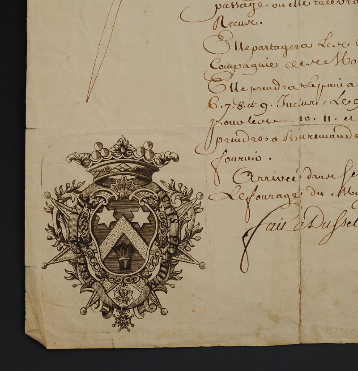 Document printed with the Arms of France and the Arms of François de Chevert, Commander Grand Cross of the Military Order of St Louis, Knight of the Royal Order of the White Eagle of Poland, Governor of the City & Citadel of Belle-Isle. Lieutenant General of the King's Armies commanding the troops of Bas-Rhin.