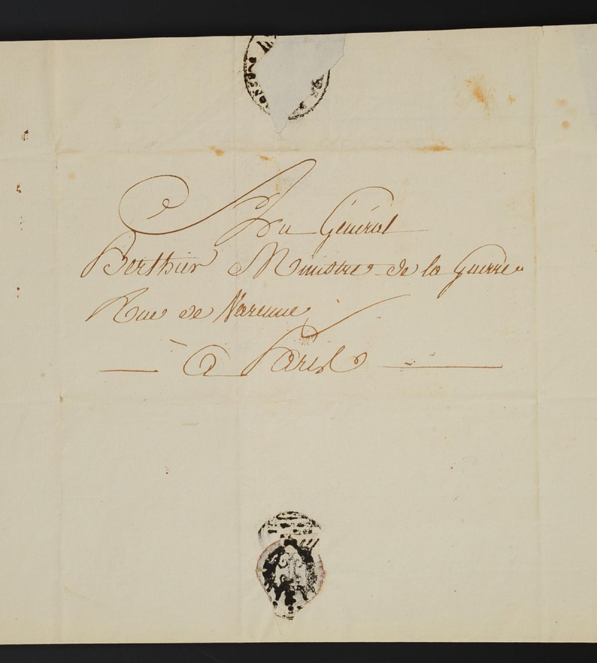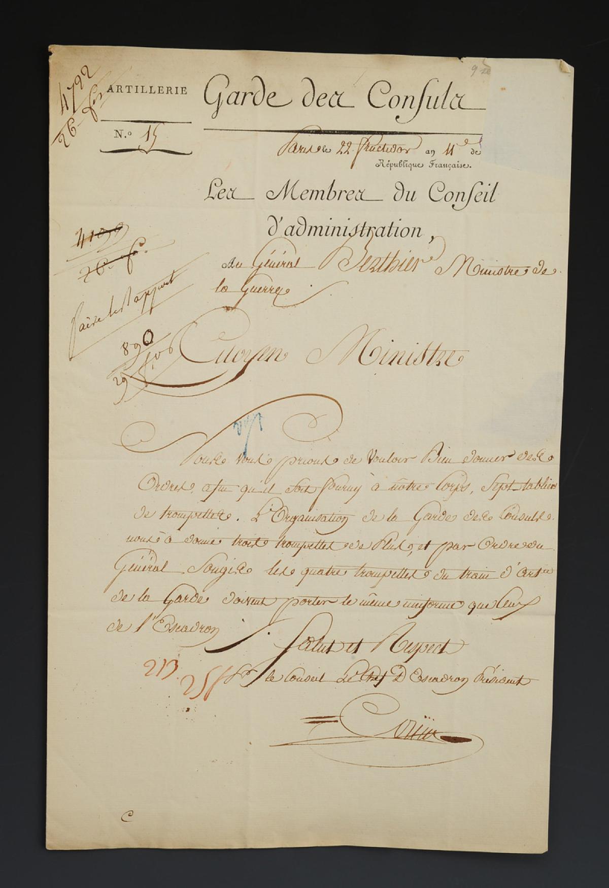 Consuls Guard Artillery Train. SIGNED REQUEST FROM COÜIN ADDRESSED TO GENERAL BERTHIER, MINISTER OF WAR FOR THE ACQUISITION OF ADDITIONAL TRUMPET APRONS, 22 fructidor year 11 (9 September 1803). 18907-2