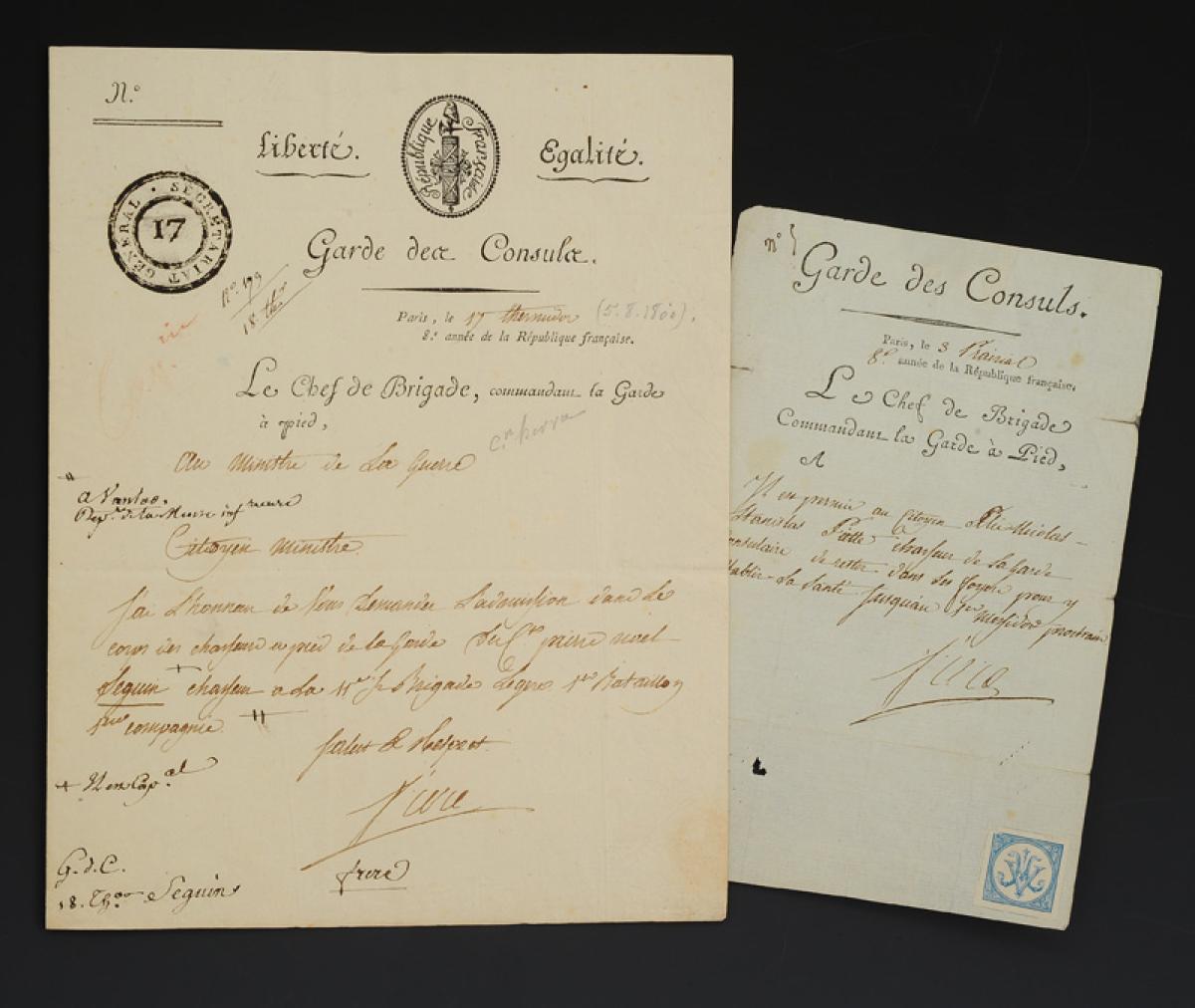Consuls' Guard INFANTRY GUARD. Lot of two documents: A letter ADDRESSED TO THE MINISTER OF WAR (5 August 1800) and a permission given to citizen PIETTE Elie to stay at home to recover his health (23 May 1800). 18907-3