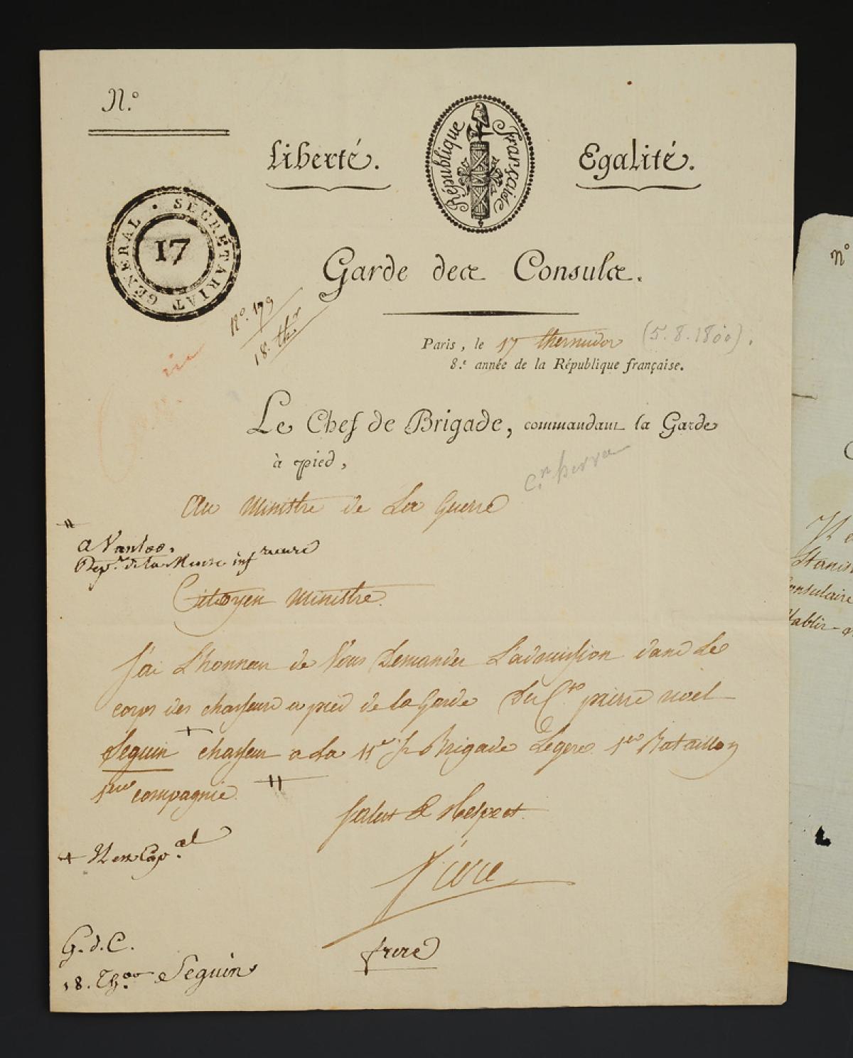 - Letter with header of the CONSULS' GUARD "LIBERTY EQUALITY" with a beautiful vignette of the French Republic. Black ink stamp "GENERAL SECRETARY 17". With address "To the Citizen / Minister of War / In Paris".