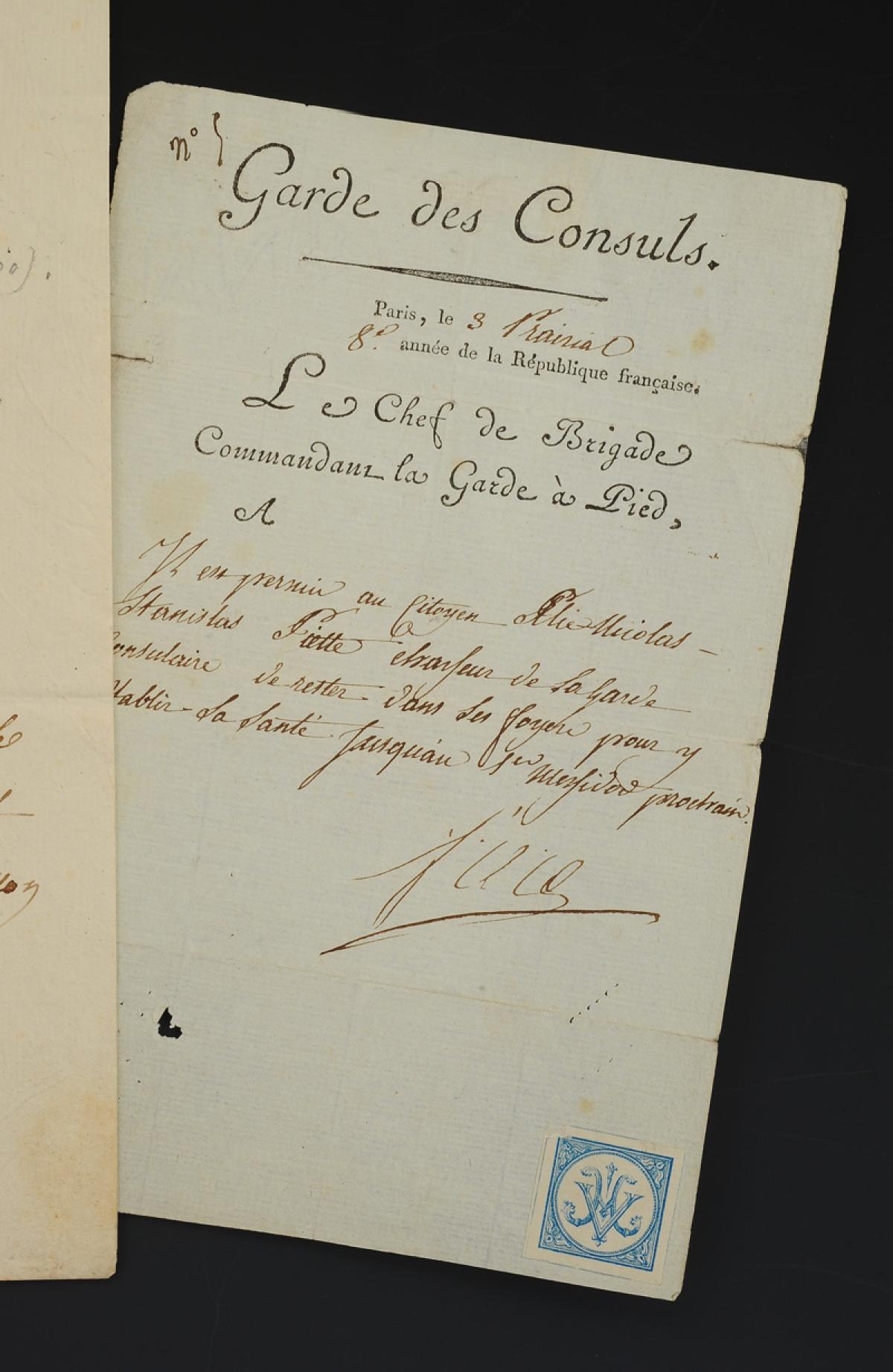 - The Chief of Brigade, commanding the Infantry Guard, "allows citizen Elie Nicolas Stanislas PIETTE, hunter of the Consular Guard, to stay in his home to recover his health until the 1st messidor next." H 18.4 cm x 11.7 cm. 1 page. Fair condition, folds reinforced at the back with tape, small holes with loss (outside the text).