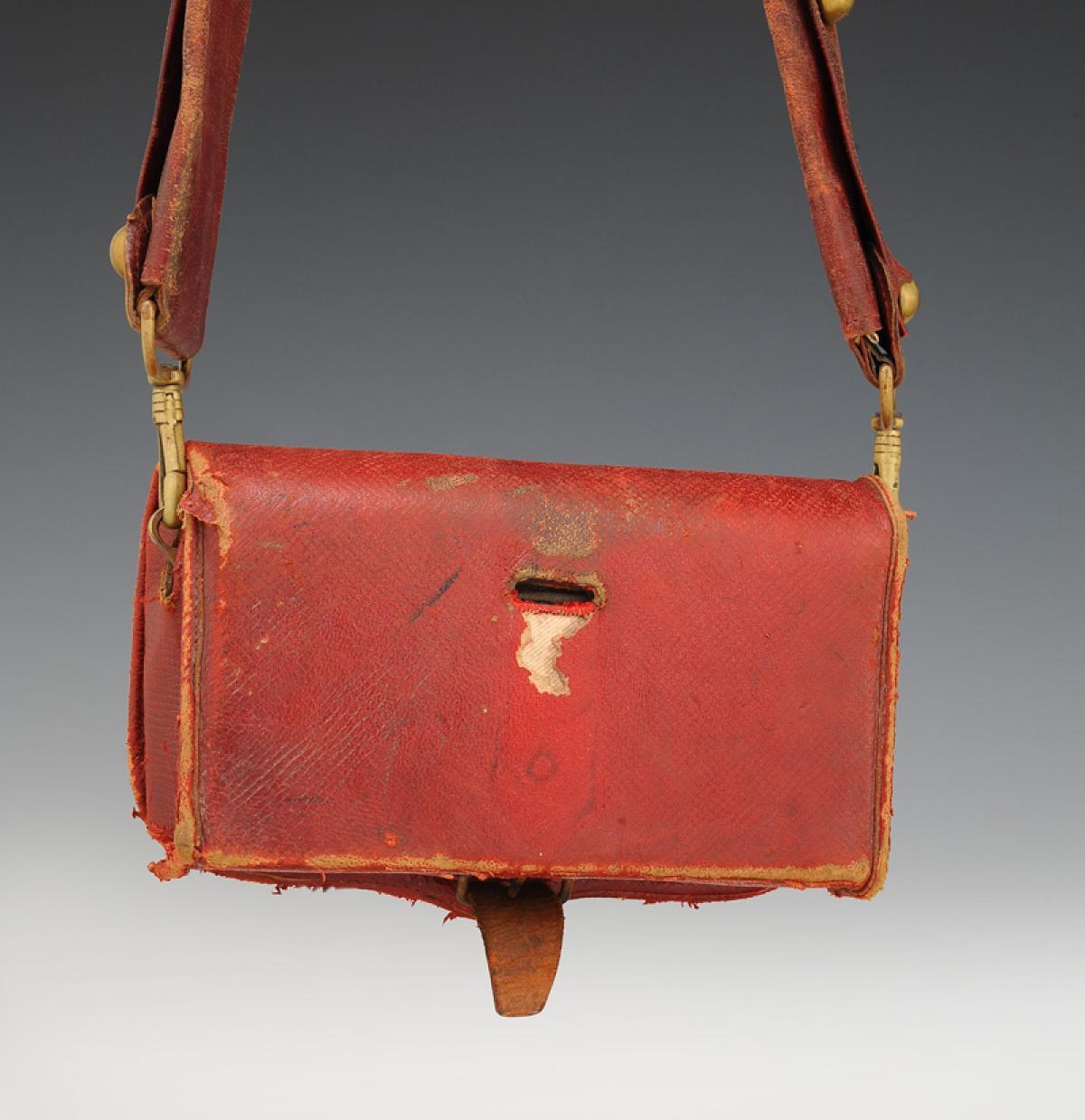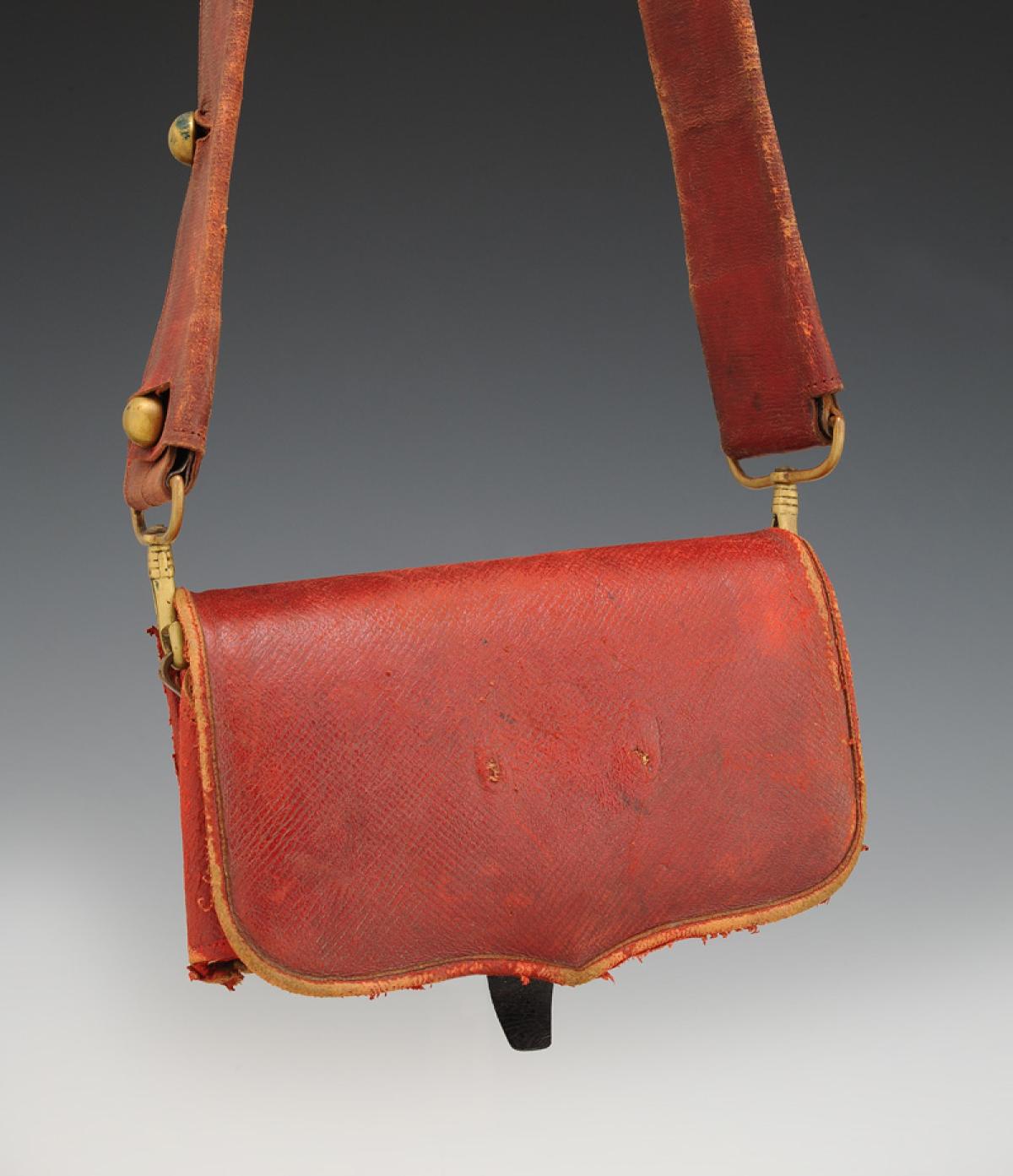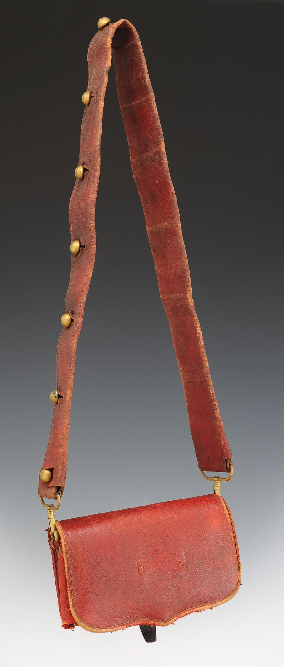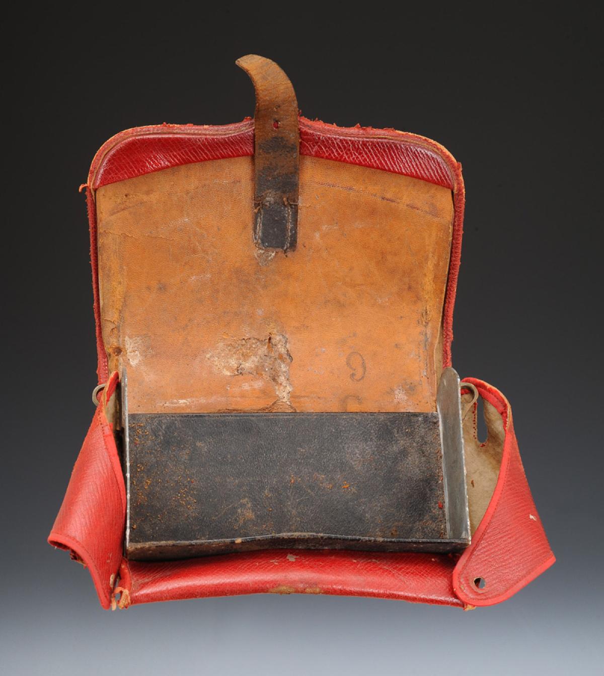 Burgundy waxed leather sash, width 5.4 cm, adorned with 13 brass half-jingle buttons. Brass hooks. Box with metal frame covered in burgundy basane leather, H 11 cm, width 18.5 cm, depth 5 cm.
