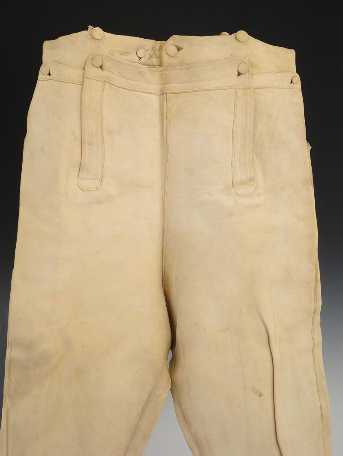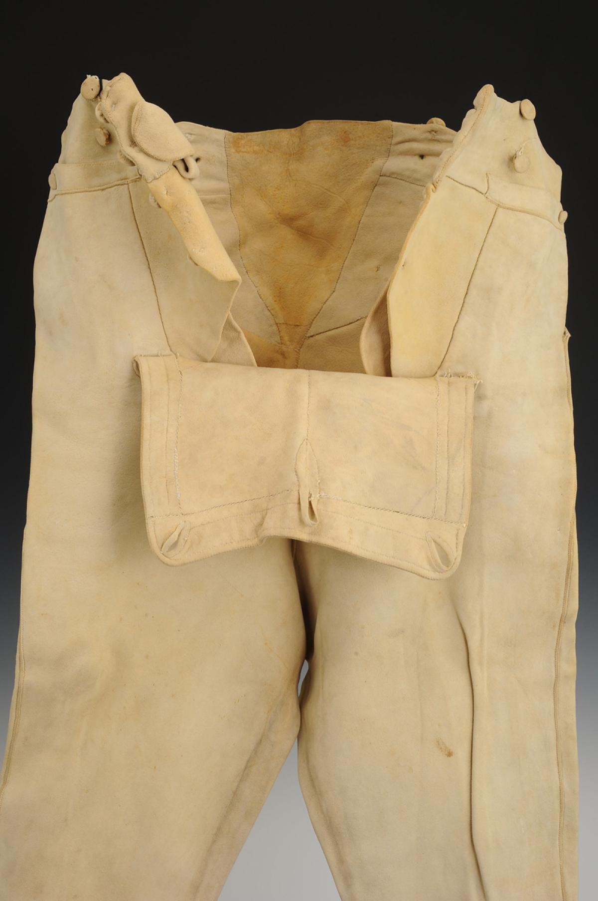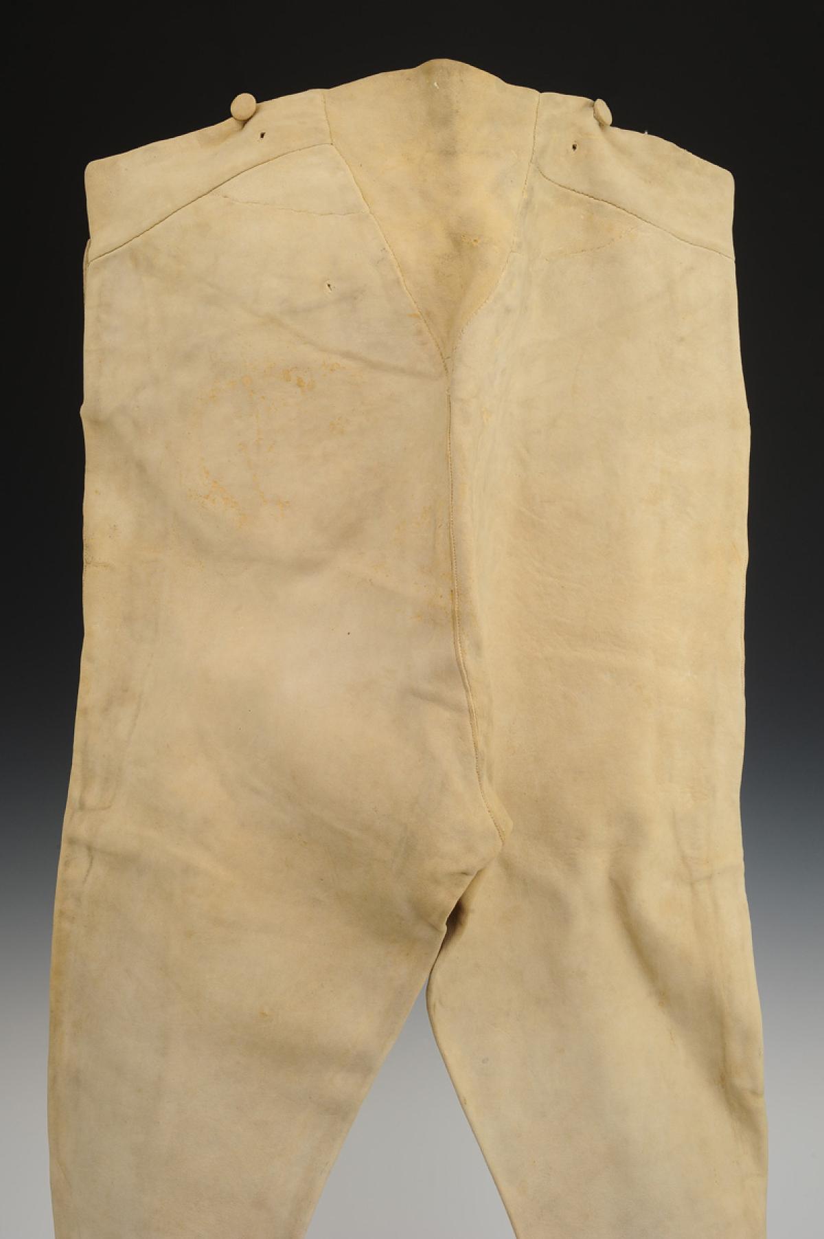 Chamois calfskin breeches with bridge system. All buttons are wooden covered in calfskin. At the front, the fly closes with four buttons, the part with the bridge closes with two side buttons and one of the fly buttons. At the waist level, four buttons (two at the front, two at the back) are intended for attaching suspenders. On either side of the fly just below the waist, two pockets are placed, each closing with a button. The bottom of each leg adjusts with four buttons and a double calfskin lace.