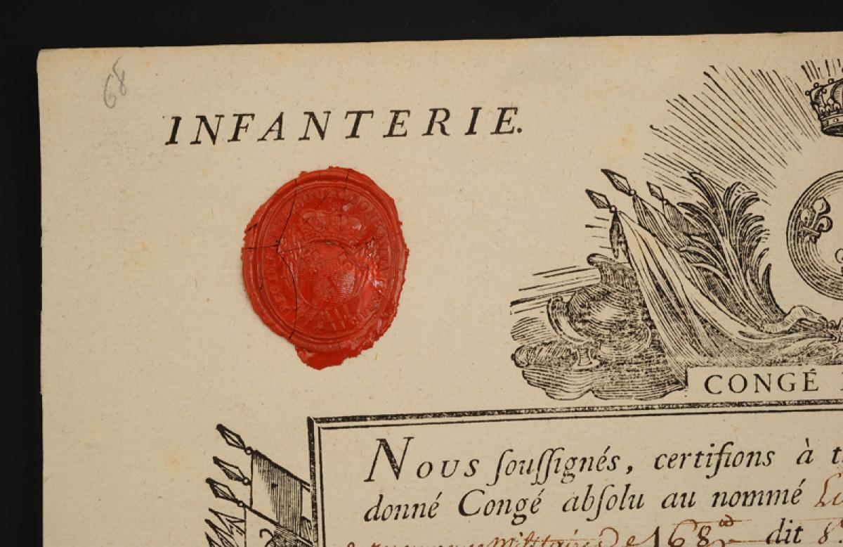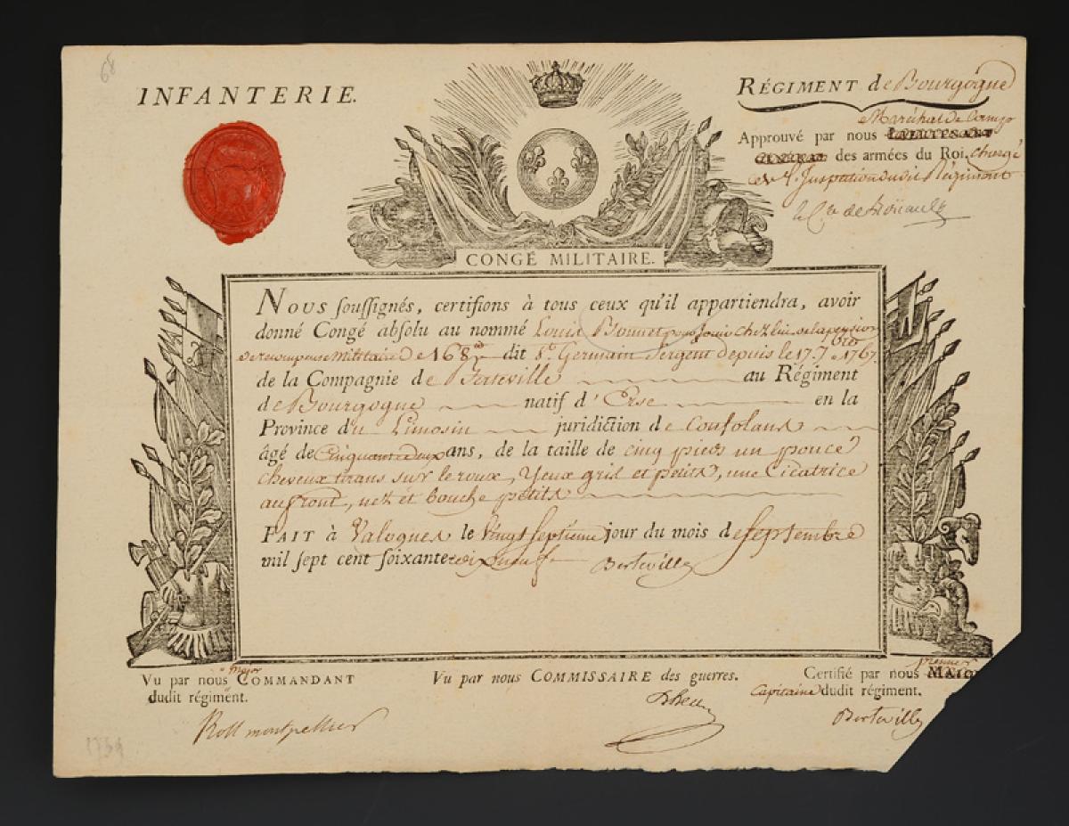 Infantry. ABSOLUTE MILITARY LEAVE ISSUED TO LOUIS BONNET, Sergeant of the Berteville Company in the Burgundy Regiment, September 27, 1779. 18908-5