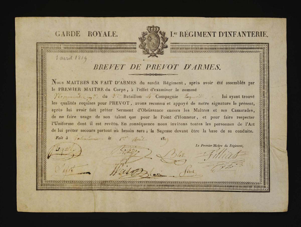 Royal Guard. 1st Infantry Regiment. PROVOST OF ARMS WARRANT AWARDED TO A MAN NAMED NORMAND, 3rd Battalion 4th Company Tocqueville, April 1, 1819. 18908-18
