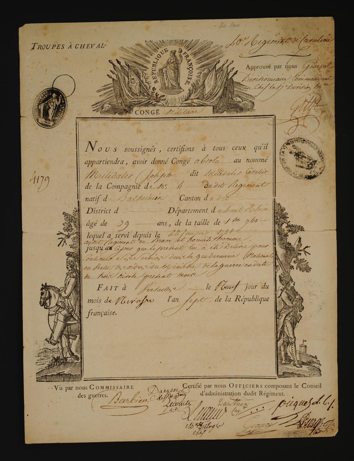 Cavalry. ABSOLUTE MILITARY LEAVE ISSUED TO JOSEPH MILIDALER, trooper of the 4th Company of the 40th Cavalry Regiment, 9 Nivôse year 7 (29 December 1798). 18908-20