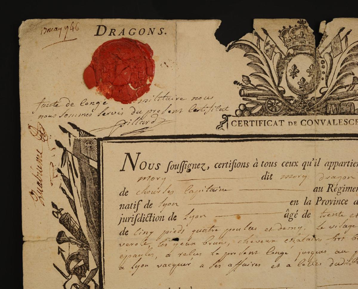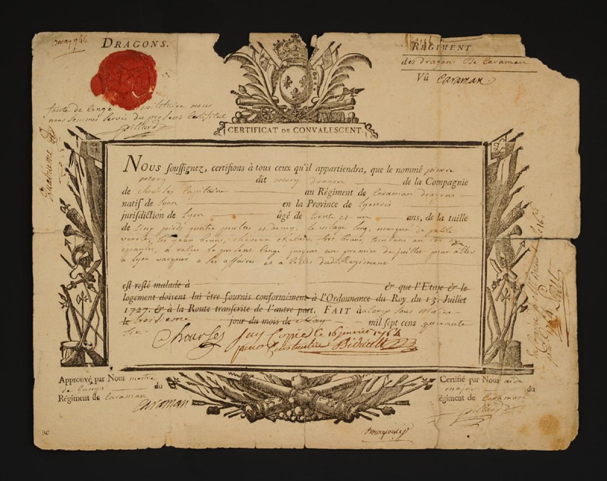 Certificate of Convalescence awarded to PIERRE MORY, Dragons de Caraman Regiment, May 13, 1746. 18908-22