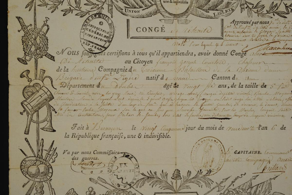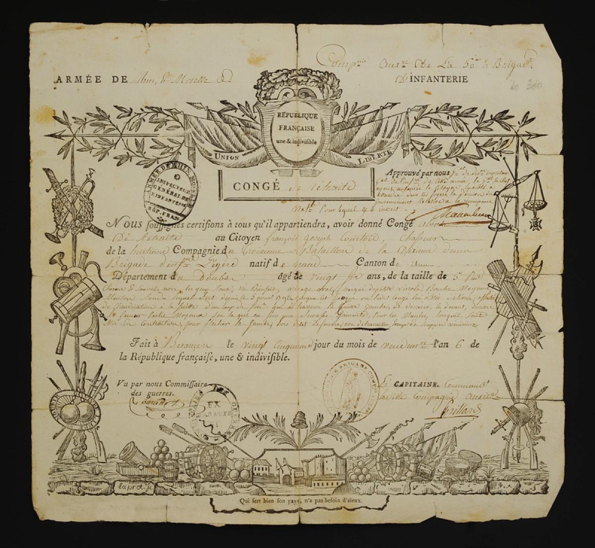 Army of the Rhine and Moselle. RETIREMENT LEAVE GRANTED TO FRANÇOIS JOSEPH COURTOIS, hunter in the 10th Demi-Brigade of Light Infantry, 25 Vendémiaire year 6 (16 October 1797). 18908-23
