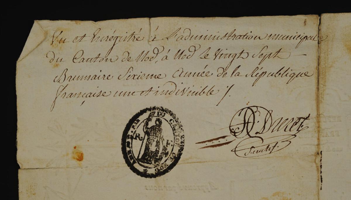 On the back, handwritten registration at the municipal administration of the canton on 27 Brumaire year 7 (17 November 1797). Black ink stamp ".... OF THE CANTON OF MOD".