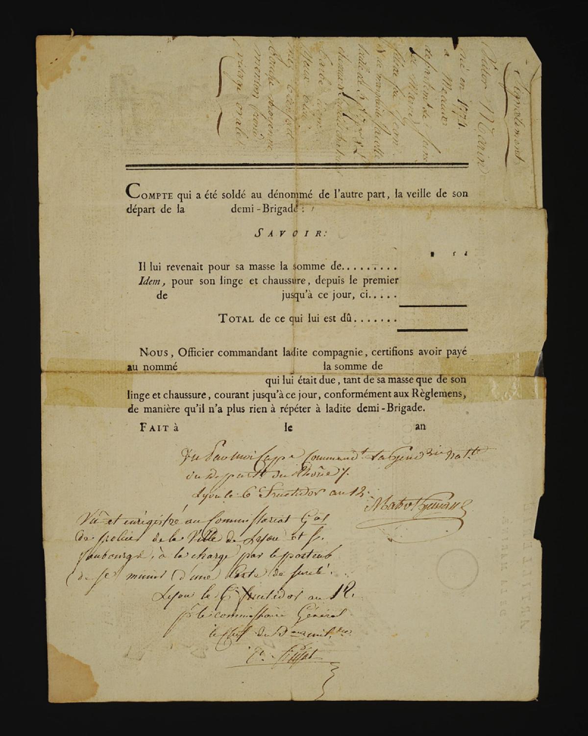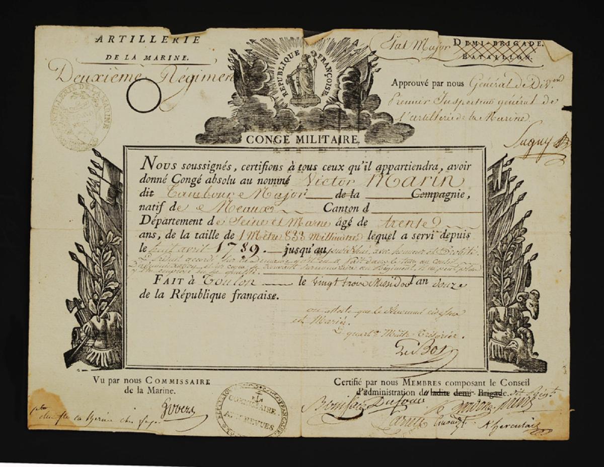 Navy Artillery 2nd Regiment. ABSOLUTE MILITARY LEAVE ISSUED TO VICTOR MARIN, drum major, 23 Messidor year 12 (July 12, 1804). 18908-27