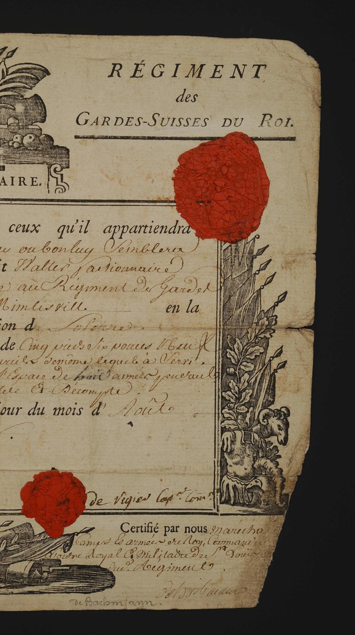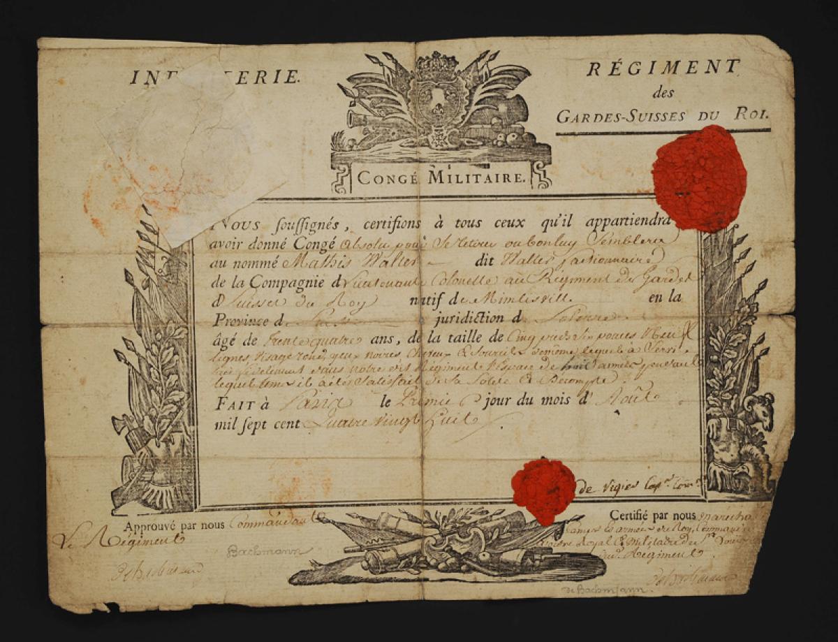 Regiment of the Swiss Guards of the King. ABSOLUTE MILITARY LEAVE GRANTED TO MATHIS WALTER, sentry in the Company of the Lieutenant Colonel, 1st August 1788. 18908-28