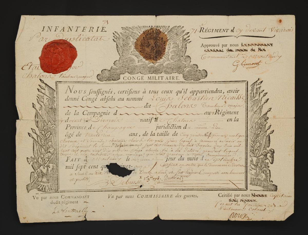 Regiment Formerly Known as Vivarais. ABSOLUTE MILITARY LEAVE ISSUED TO LOUIS SÉBASTIEN NICAISSE, drum major, September 11, 1791. 18908-29