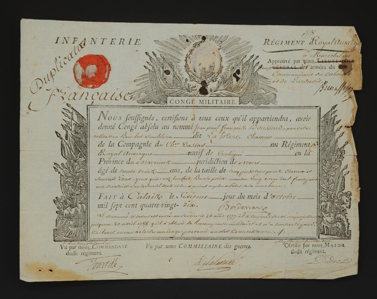 Royal Auvergne Regiment. ABSOLUTE MILITARY CERTIFICATE GIVEN TO JEAN PAUL FRANÇOISE BOUSSARD, hunter of the Dassas Company, October 7, 1790. 18908-30