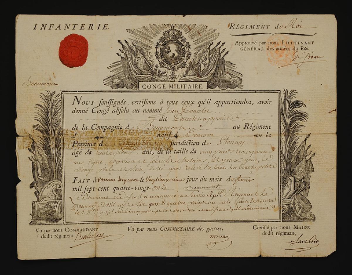 Absolute leave granted on February 22, 1791, to Jean PONCELET assigned to the Company of Beaumont in the Regiment of the King, where he began his service on April 1, 1781.