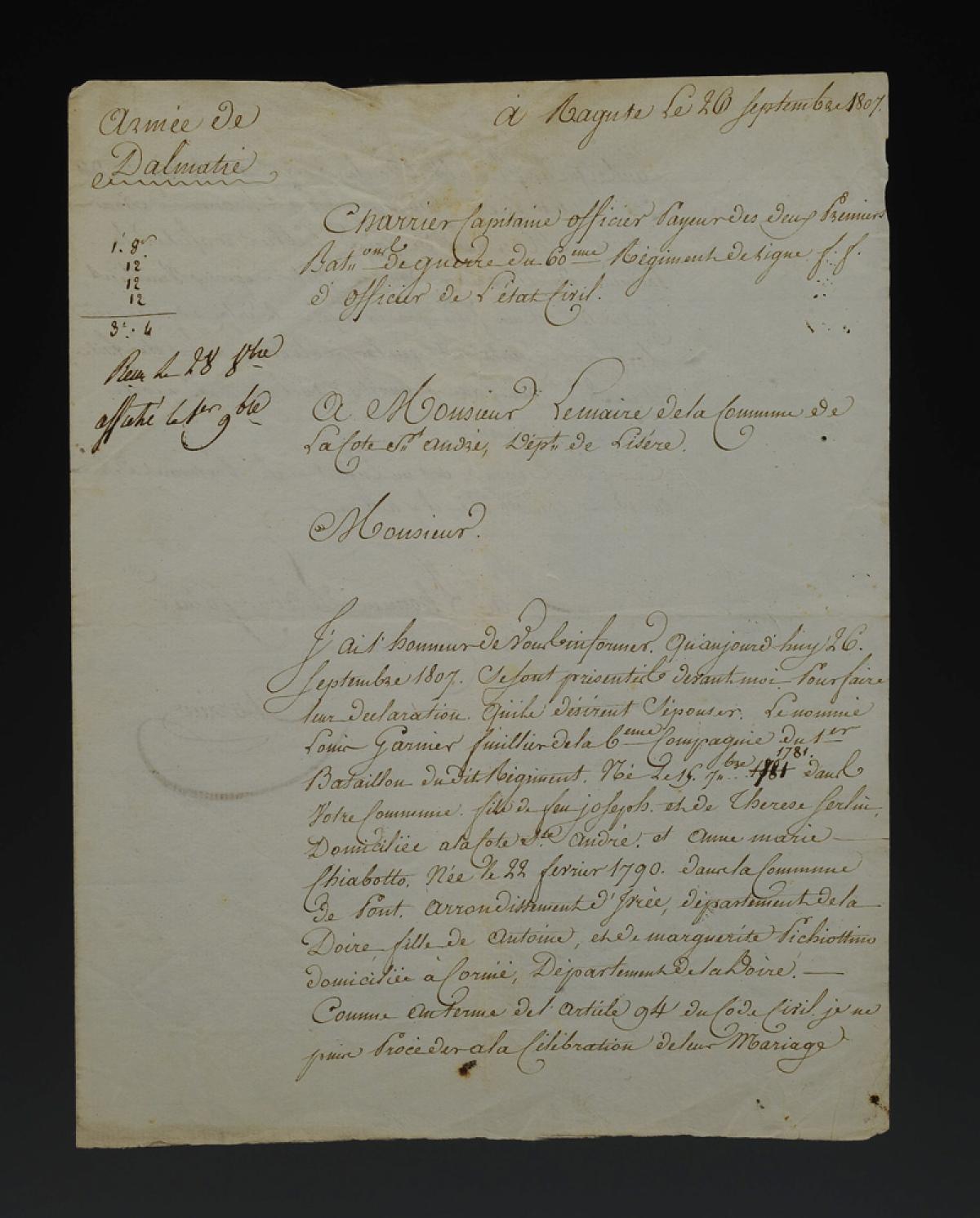Army of Dalmatia. 60th Line Regiment. Letter from Captain Charrier to the mayor of the municipality of La Côte St André (Isère) informing him of the desire of Louis GARNIER, a rifleman in the said regiment, to marry Anne Marie Chiabotto, Ragusa on September 26, 1807. 18909-7