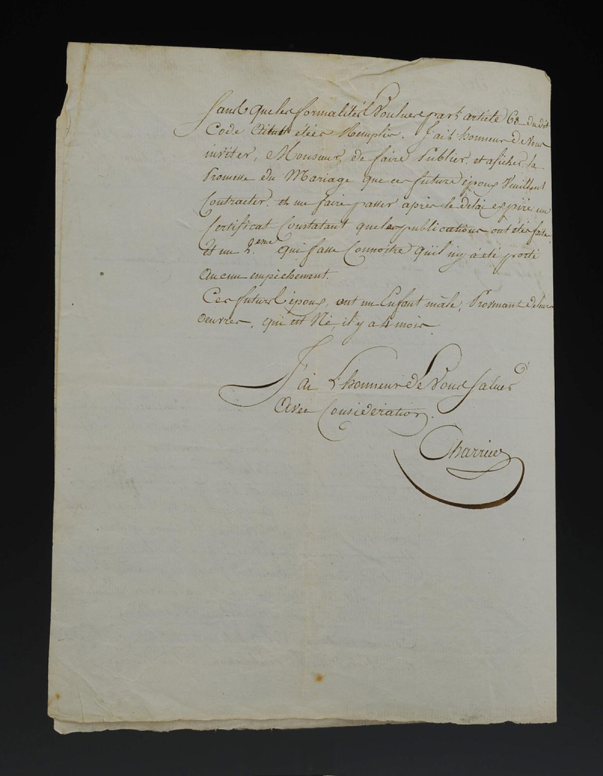 The rifleman Louis GARNIER of the 6th Company of the 1st battalion of the said Regiment, born on September 15, 1781 in the municipality of La Côte St André, wishes to marry Anne Marie Chiabotto. Captain Charrier informs the mayor of La Côte St André to proceed with the publication and posting of the marriage promise, "as required by article 94 of the civil code".