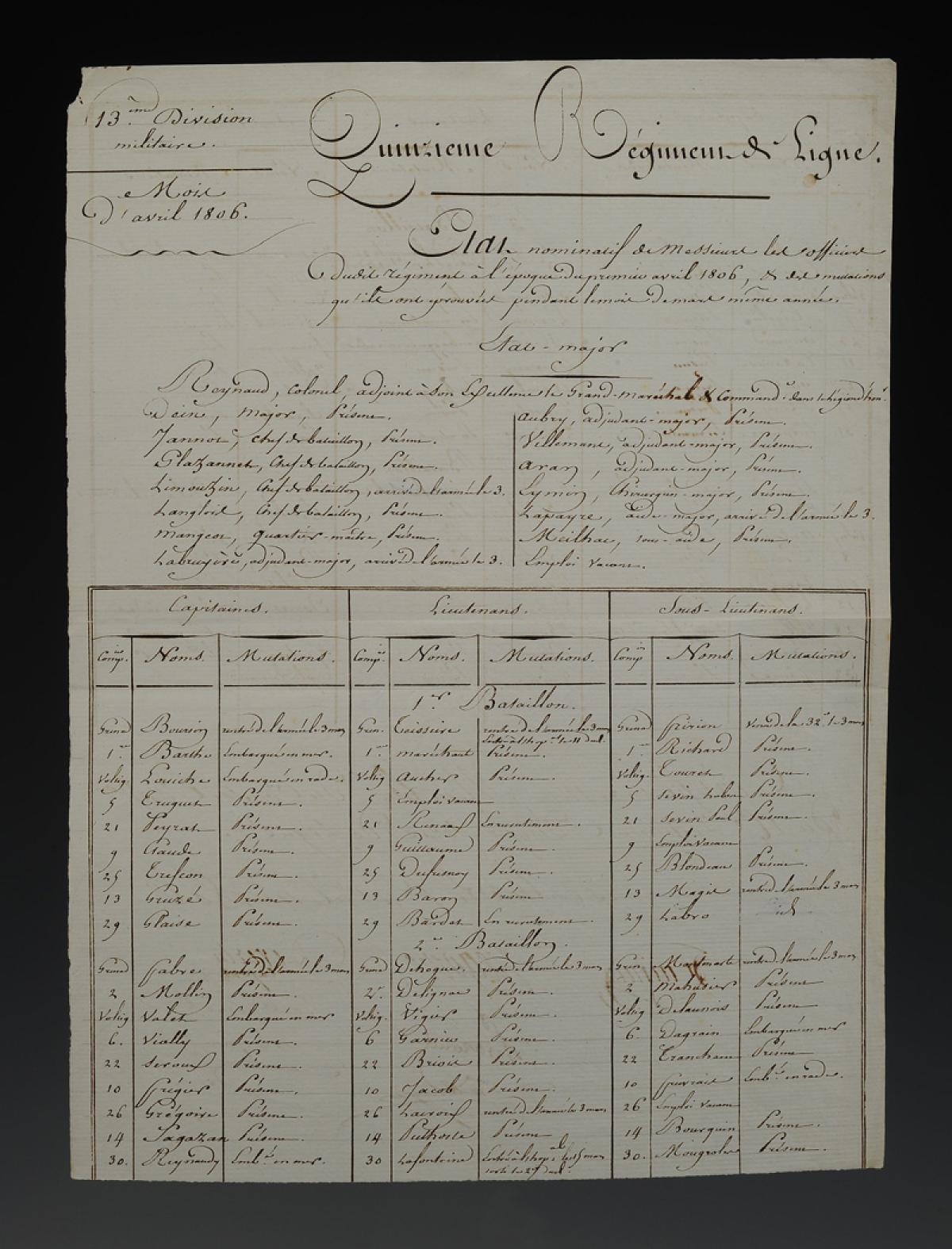 15th Line Infantry Regiment. 13th Military Division. NOMINATIVE LIST OF OFFICERS OF THE SAID REGIMENT as of April 1, 1806. 18909-8