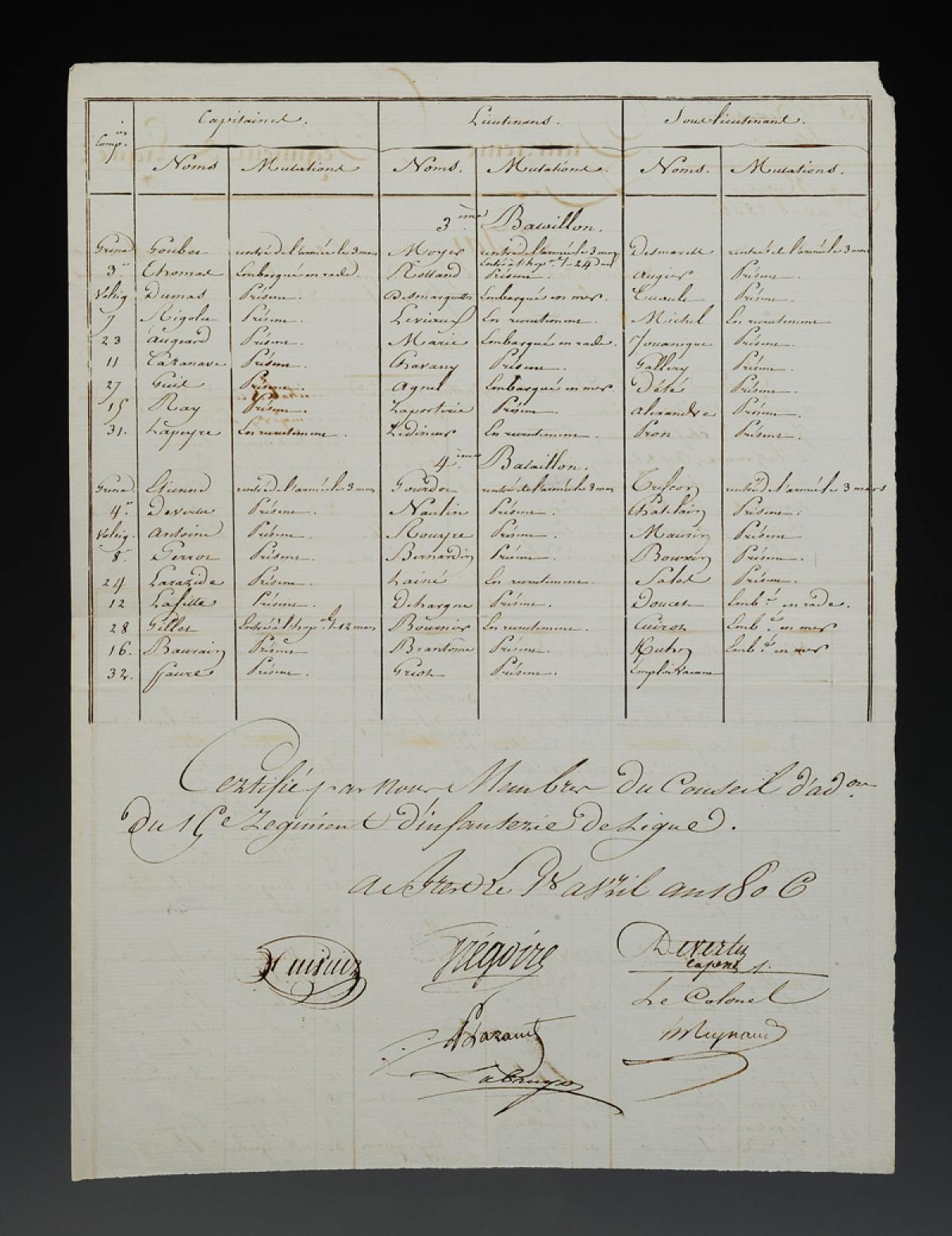 Completely handwritten table, signed by Colonel Reynaud on April 1, 1806.