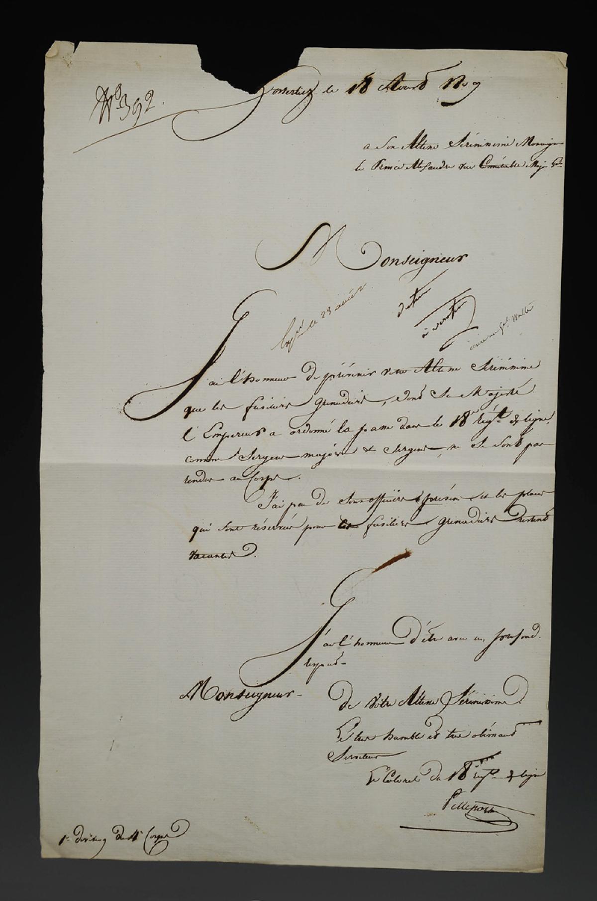 18th Infantry Regiment of the Line. SIGNED AUTOGRAPH LETTER BY COLONEL PELLEPORT TO "HIS SERENE HIGHNESS MONSIGNOR PRINCE ALEXANDER (...) MAJOR GENERAL CONSTABLE", August 1809. 18909-11