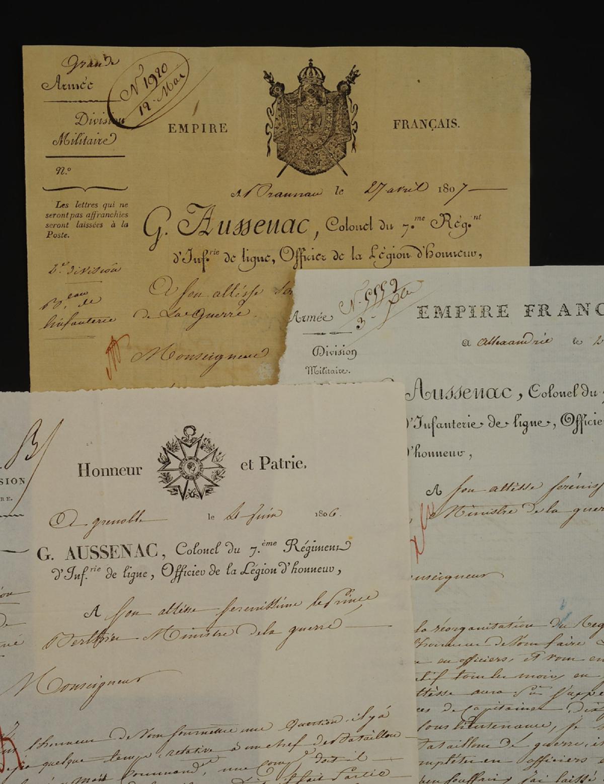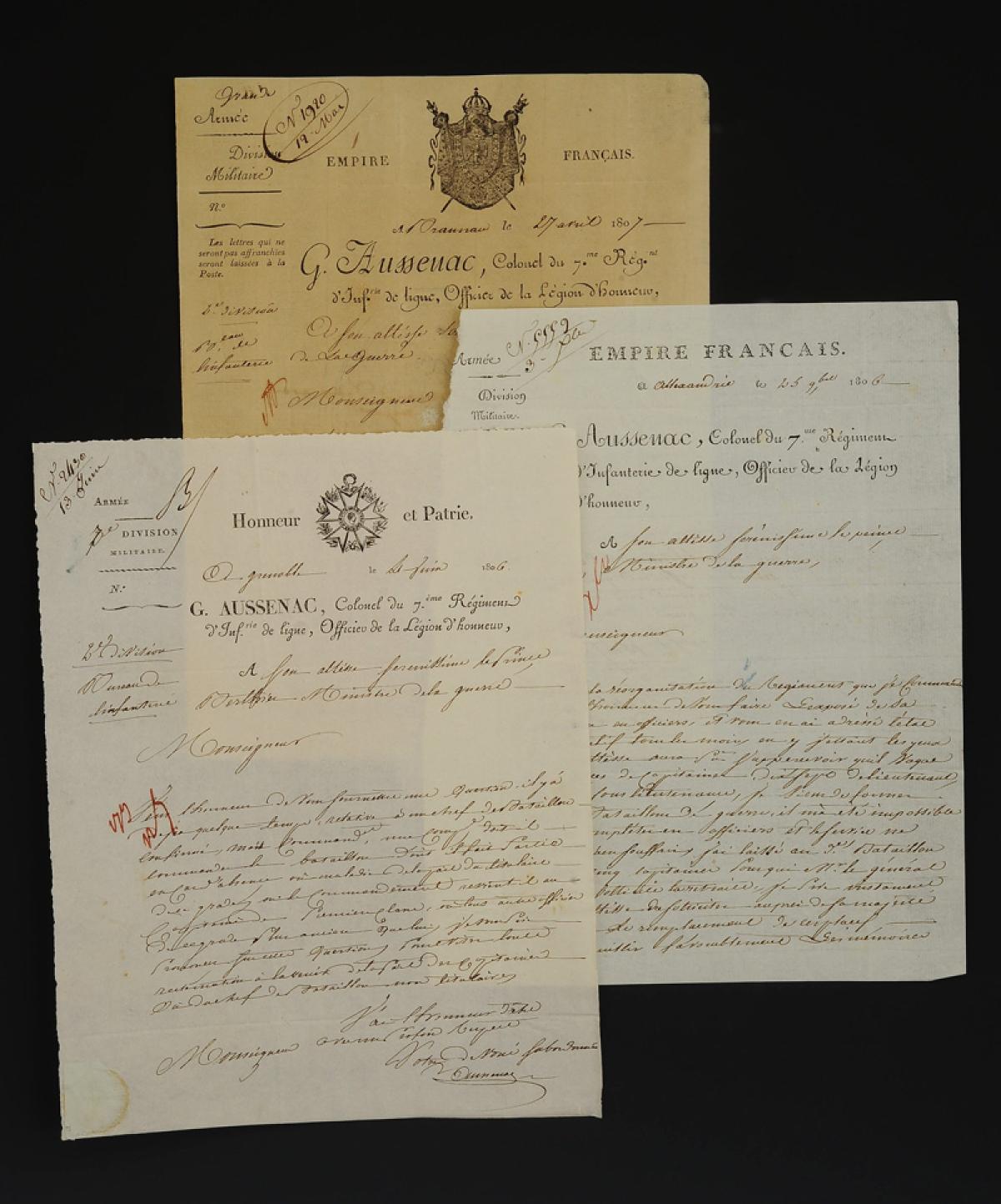 Great Army. 7th Line Infantry Regiment. THREE AUTOGRAPH LETTERS SIGNED BY COLONEL G. AUSSENAC, dated 1806 and 1807, addressed to the Minister of War. 18909-15