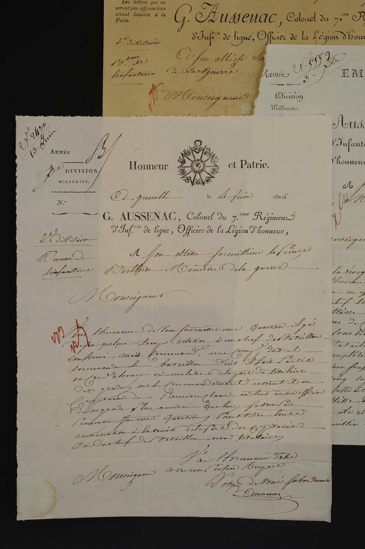 - Grenoble, June 4, 1806. Letter with header of the Legion of Honor "HONOR AND COUNTRY" "2nd Division / Infantry Bureau." The colonel poses a question about the command of a company in case of illness or absence of the titular officer.