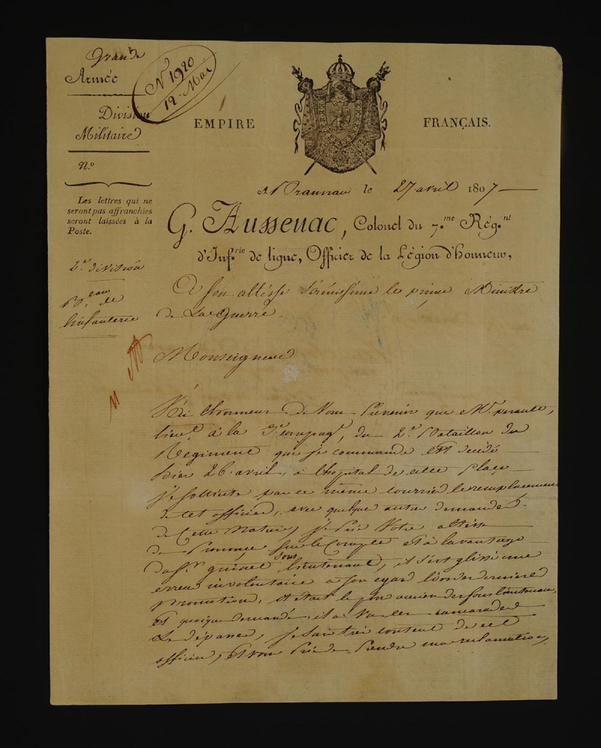 - Braunau, April 27, 1807. Header "FRENCH EMPIRE" with a beautiful vignette. "2nd Division / Infantry Bureau."