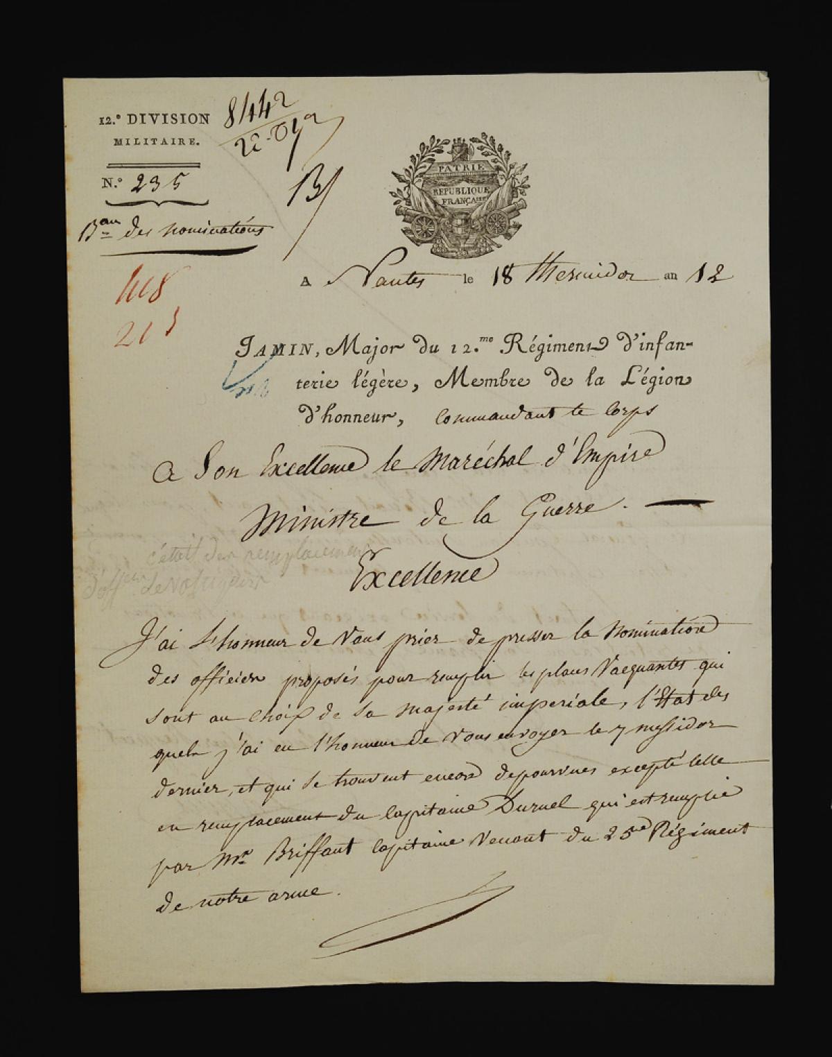 12th Light Infantry Regiment. MAJOR JAMIN WRITES TO THE MINISTER OF WAR to expedite the appointment of officers to vacant positions, Nantes, 18 Messidor year 12 (July 7, 1804). 18909-19