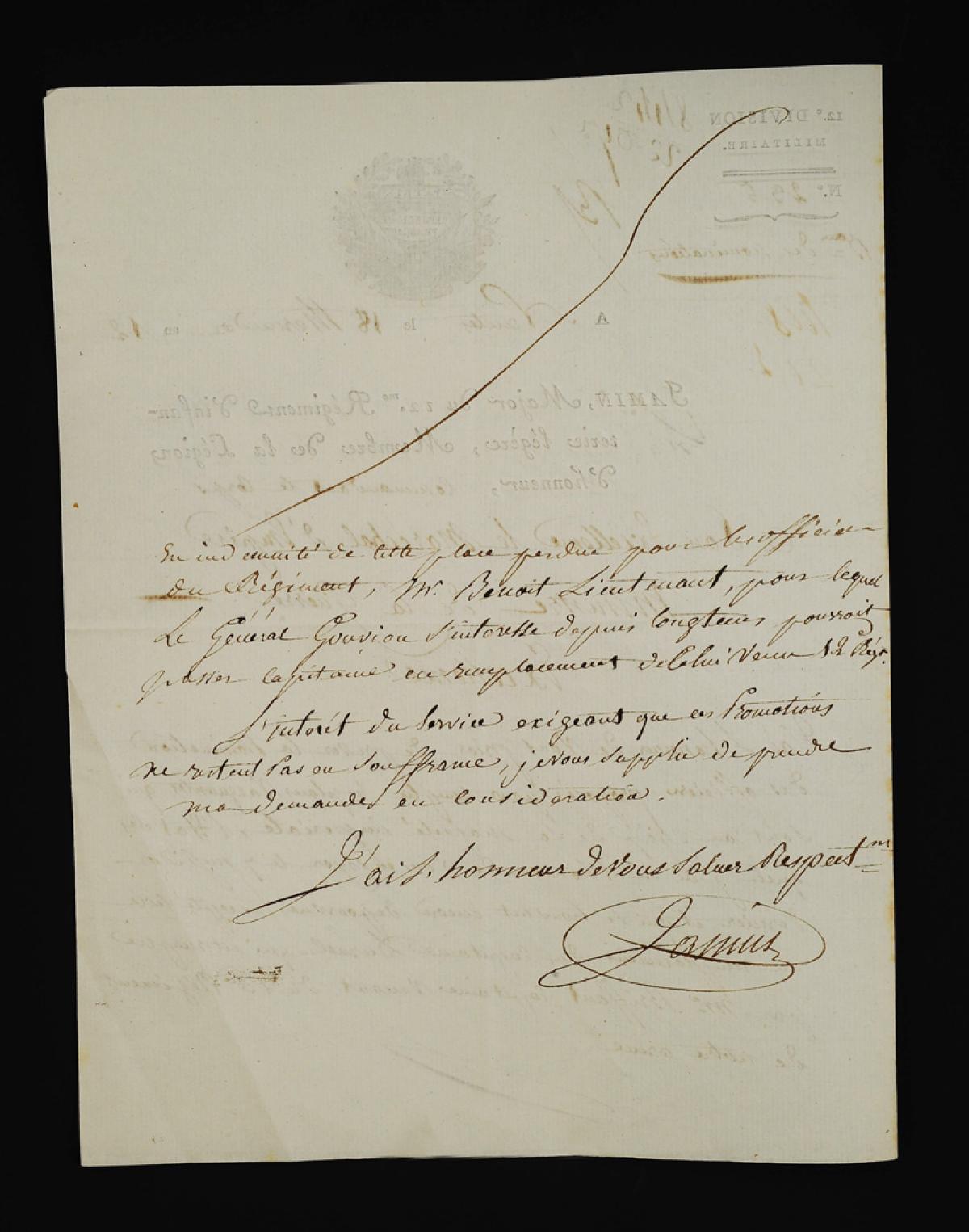 "JAMIN, Major of the 12th Light Infantry Regiment, Member of the Legion of Honor, commanding the Corps, To His Excellency the Marshal of the Empire Minister of War."