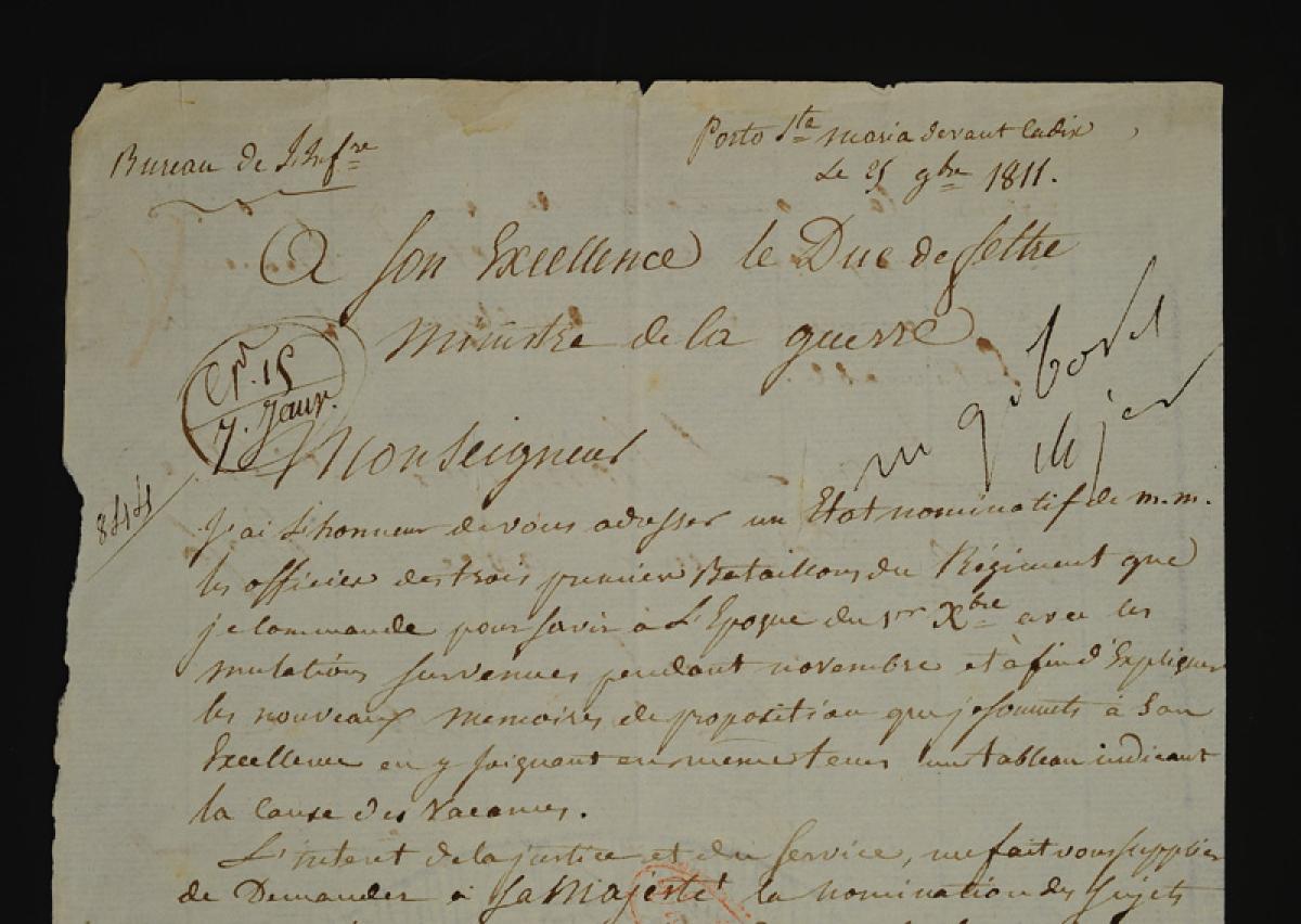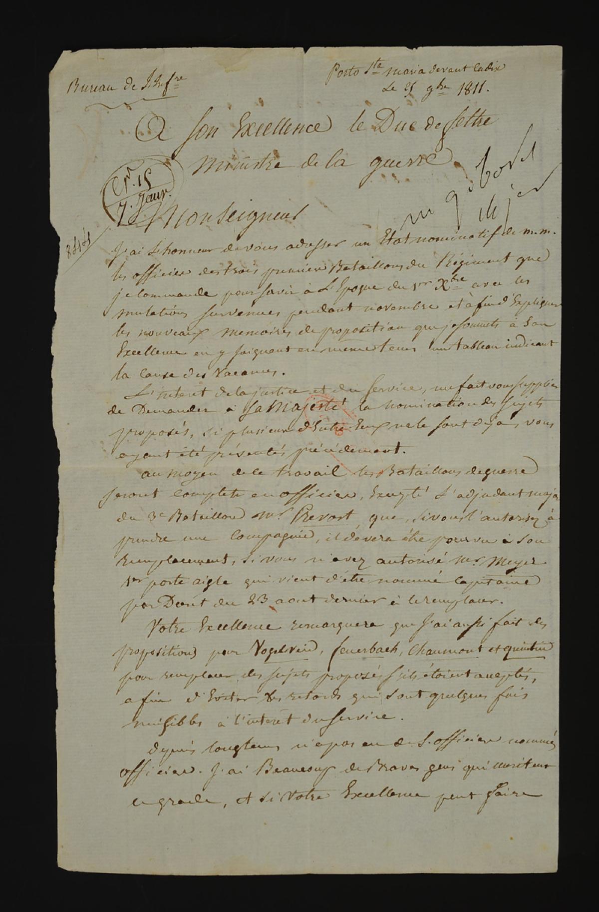 24th Line Infantry Regiment. SIGNED AUTOGRAPH LETTER FROM COLONEL JAMIN TO THE MINISTER OF WAR, DUKE OF FELTRE, urgently requesting the appointment of the proposed officers and non-commissioned officers, November 25, 1811. 18909-20