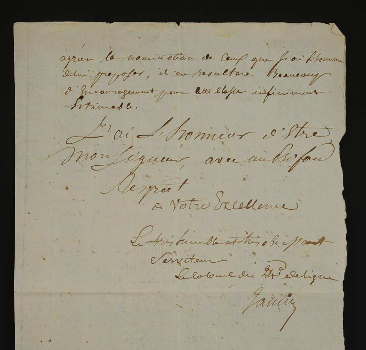 Colonel Jamin provides a list of officers and non-commissioned officers for whom he wishes urgent appointments. "I have many brave individuals who deserve promotion, and if Your Excellency can approve the appointment of those whom I have the honor to propose, it will result in a great deal of encouragement for this immensely commendable class...". Signed by Colonel of the 24th Line Infantry Regiment. Signed "Jamin".